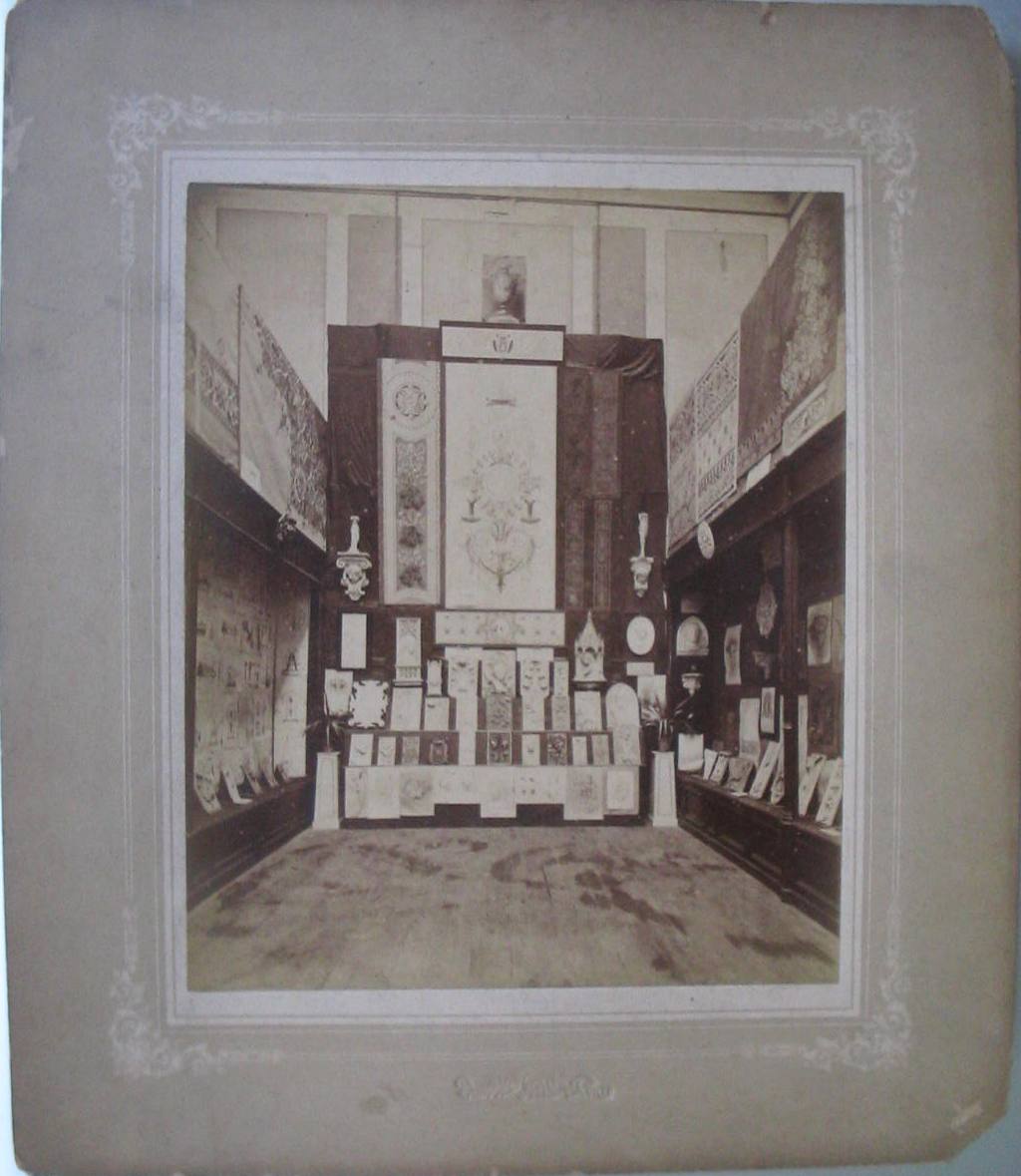 Vista geral de uma exposição de trabalhos de alunos. Zona central da sala de exposição, focando em moldes de gesso e bustos, nichos neogóticos com figuras sacras e pormenores de artes decorativas. Ao centro, duas placas identifica a cadeira (ilegível). Acima, desenhos de pintura decorativa.