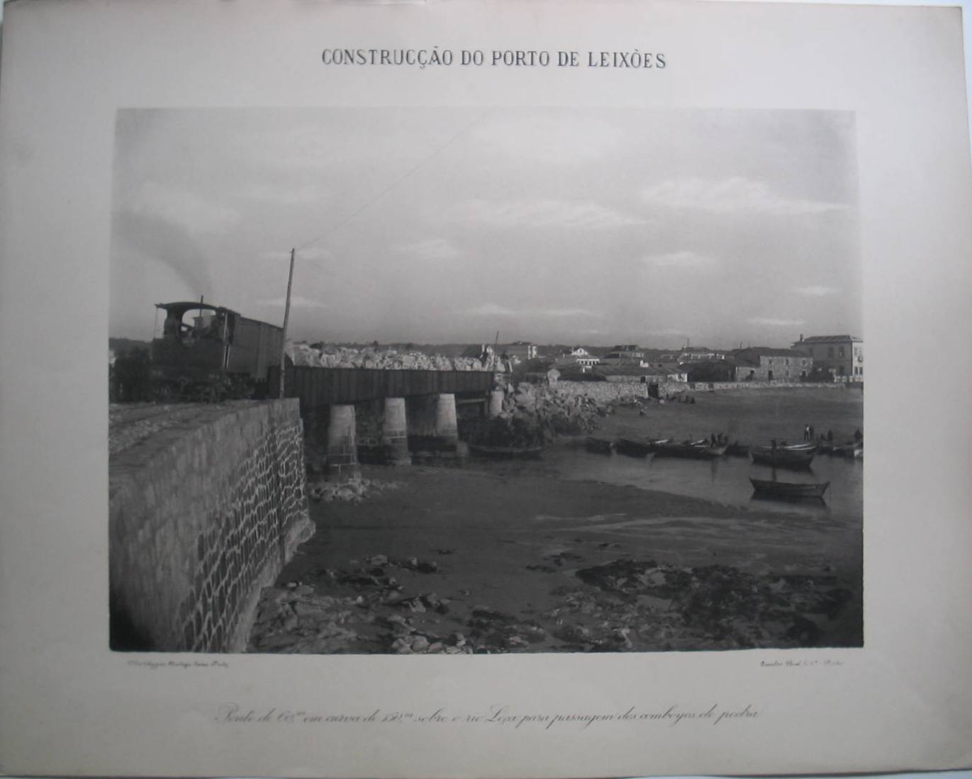 | Observações: | A fotografia está titulada, na margem superior, em letrais capitais: «CONSTRUCÇÃO DO PORTO DE LEIXÕES», e, na margem inferior, em corsiva: «Ponte de 60m, em curva de 150m, sobre o rio Leça para a passagem dos comboyos de pedra». Faz parte de um conjunto de 34 fototipias da construção do Porto de Leixões. O estúdio responsável pela reprodução está identificado do lado esquerdo, abaixo da fotografia: «Phototypia Antiga Caza Fritz» e, sob o canto direito: «Emílio Biel & C.ª - Porto». Existem dois carimbos do Instituto Superior de Engenharia do Porto, no verso da fototipia. |