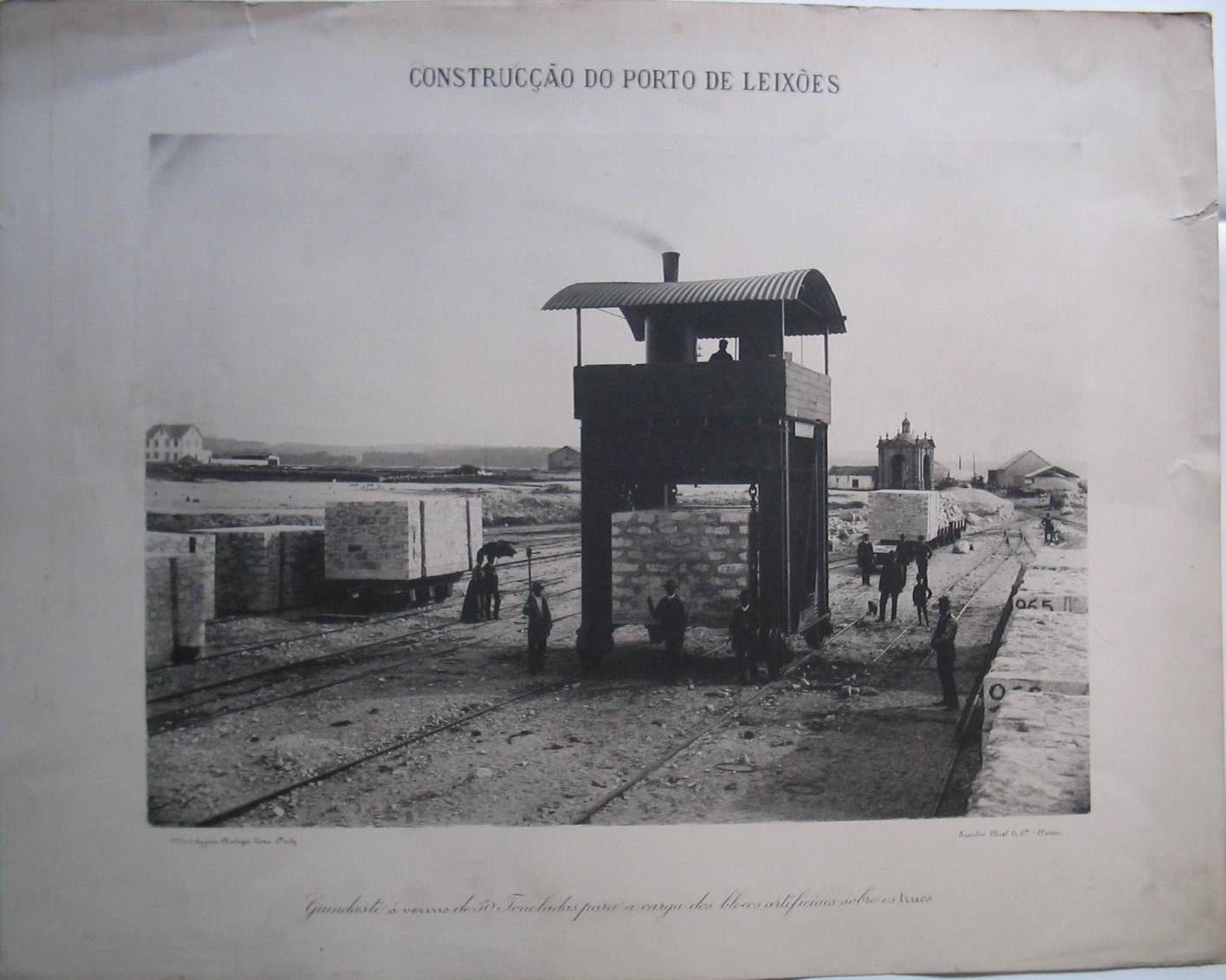 A fotografia está titulada, na margem superior, em letrais capitais: «CONSTRUCÇÃO DO PORTO DE LEIXÕES», e, na margem inferior, em corsiva: «Guindaste 'à verins' de 50 Toneladas para a carga dos blocos artificiaes sobre os 'trucs'» (o texto que está entre «'», está em itálico na fototipia). Faz parte de um conjunto de 34 fototipias da construção do Porto de Leixões. O estúdio responsável pela reprodução está identificado do lado esquerdo, abaixo da fotografia: «Phototypia Antiga Caza Fritz» e, sob o canto direito: «Emílio Biel & C.ª - Porto». Existem dois carimbos do Instituto Superior de Engenharia do Porto, no verso da fototipia.