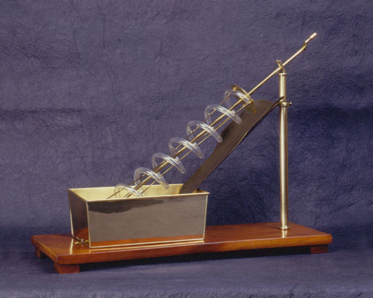 | Finalidade: | Utilizado como modelo demonstrativo que simulava a elevação de um líquido entre dois níveis, fazendo-o percorrer uma trajetória em espiral. |