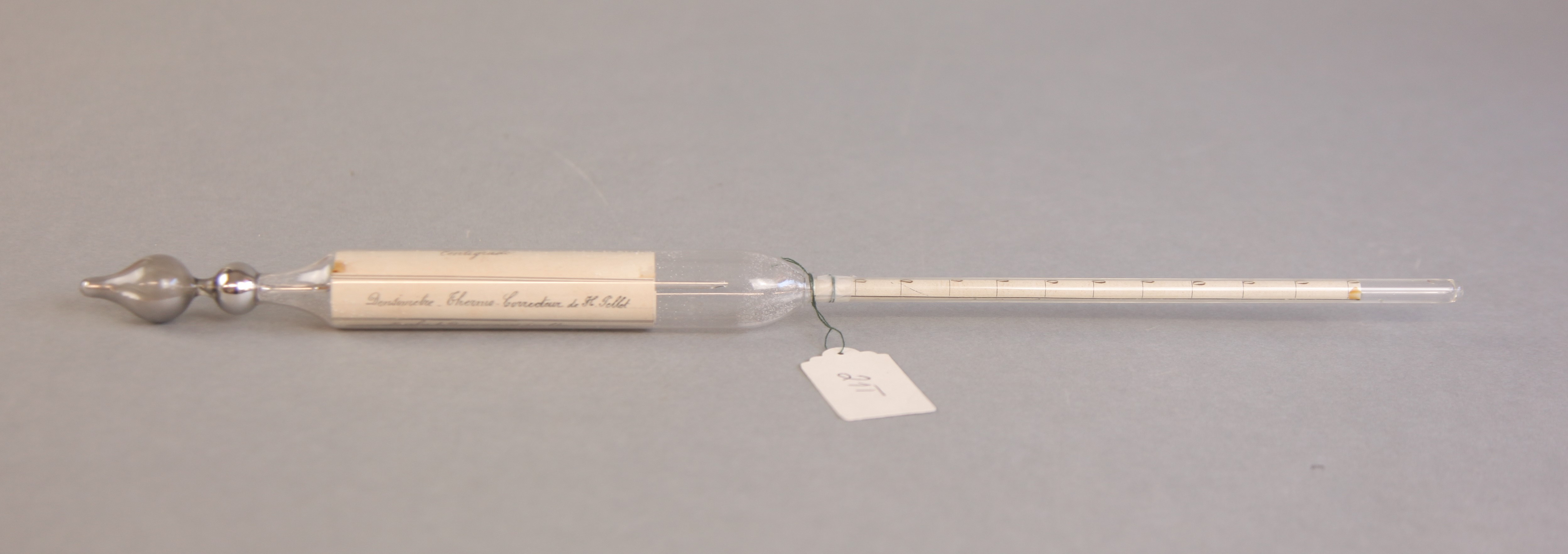 | História do Objecto: | Os densímetros são areómetros de peso constante que permitem determinar densidades de sólidos ou líquidos por considerações baseadas no princípio de equilíbrio dos corpos flutuantes (princípio de Arquimedes). O seu princípio de funcionamento deve-se a Joseph Gay-Lussac (1778-1850). |