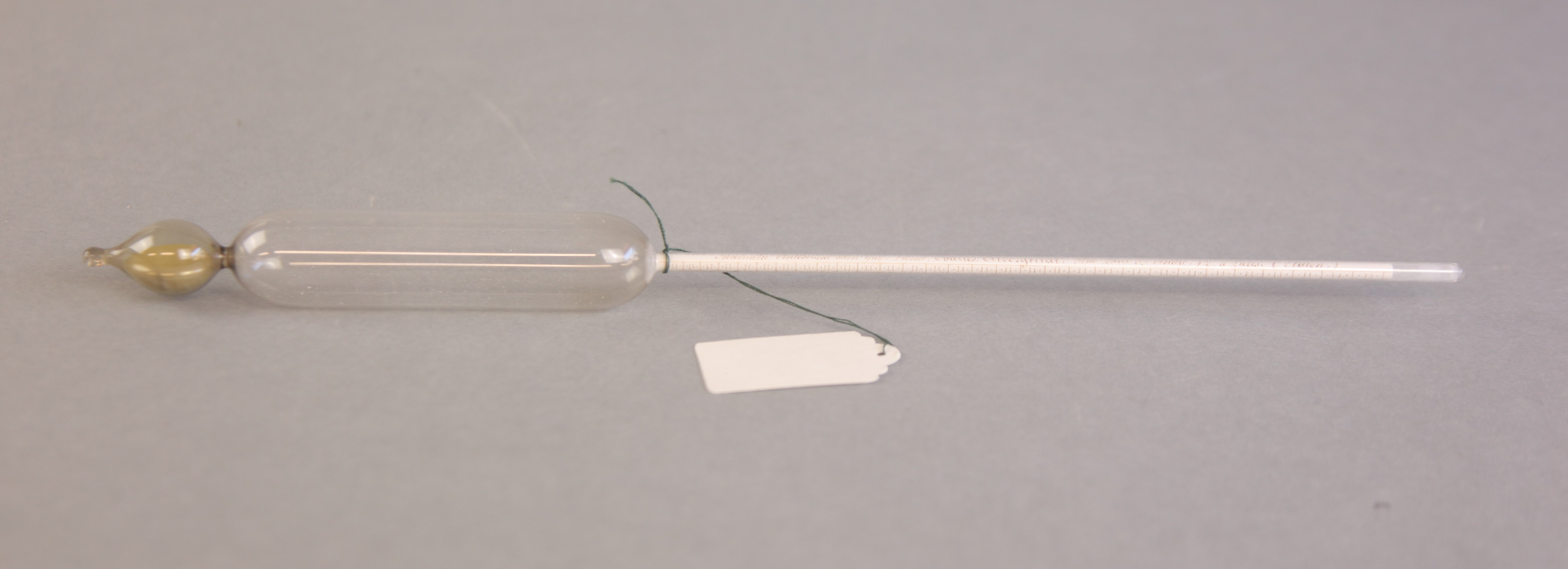 | Descrição: | Composto por um tubo de vidro perfeitamente cilíndrico apresentando na parte inferior uma ampola e por baixo desta, outra mais pequena terminada em ponta, com mercúrio para ficar o centro de gravidade por baixo do centro de impulsão e conservar a haste vertical quando flutua. Este difere do de Baumé pelo modo de gradação e pelo seu uso. |