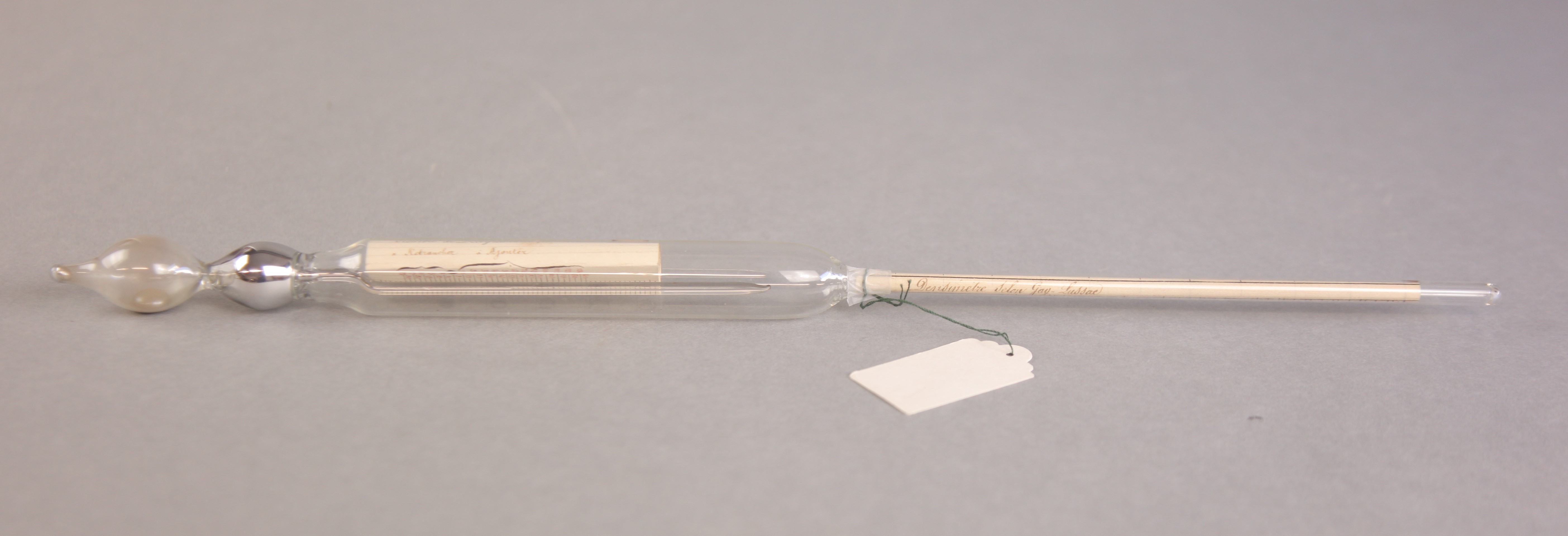 | Descrição: | Composto por um tubo de vidro perfeitamente cilíndrico apresentando na parte inferior uma ampola e por baixo desta, outra mais pequena terminada em ponta, com mercúrio para ficar o centro de gravidade por baixo do centro de impulsão e conservar a haste vertical quando flutua. |