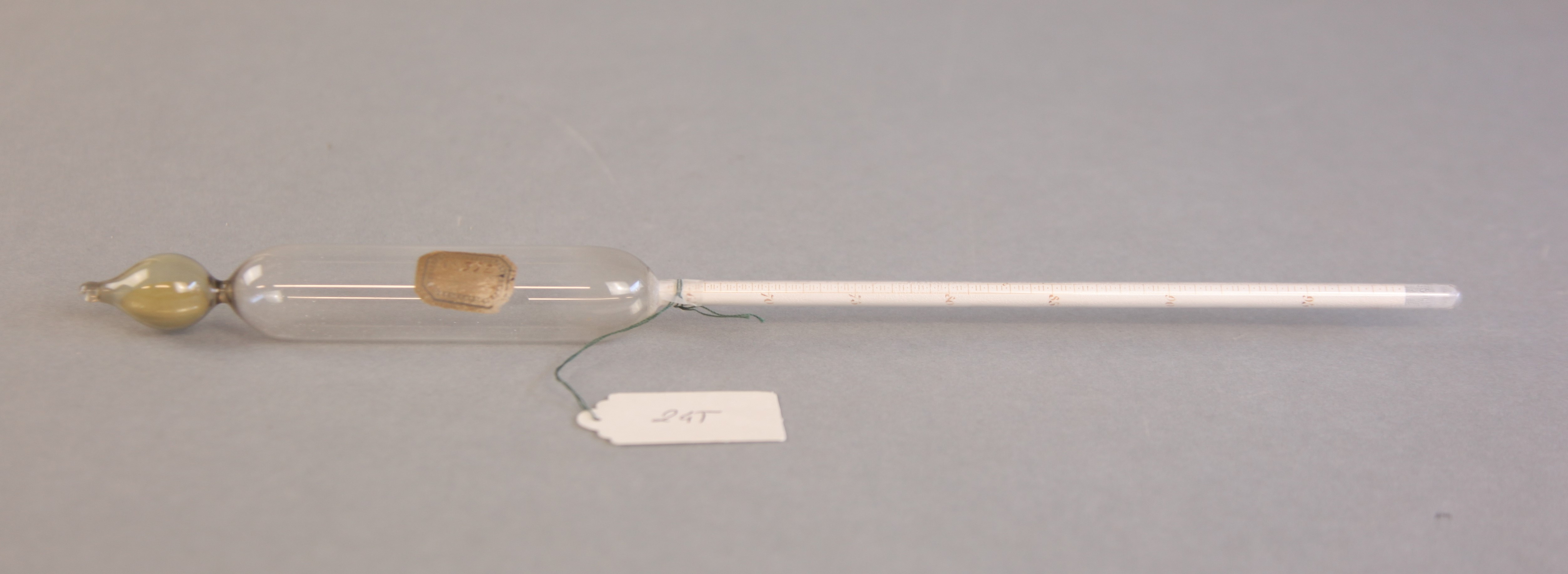 | Descrição: | Composto por um tubo de vidro perfeitamente cilíndrico apresentando na parte inferior uma ampola e por baixo desta, outra mais pequena terminada em ponta, com mercúrio para ficar o centro de gravidade por baixo do centro de impulsão e conservar a haste vertical quando flutua. Este difere do de Baumé pelo modo da graduação e pelo seu uso. |