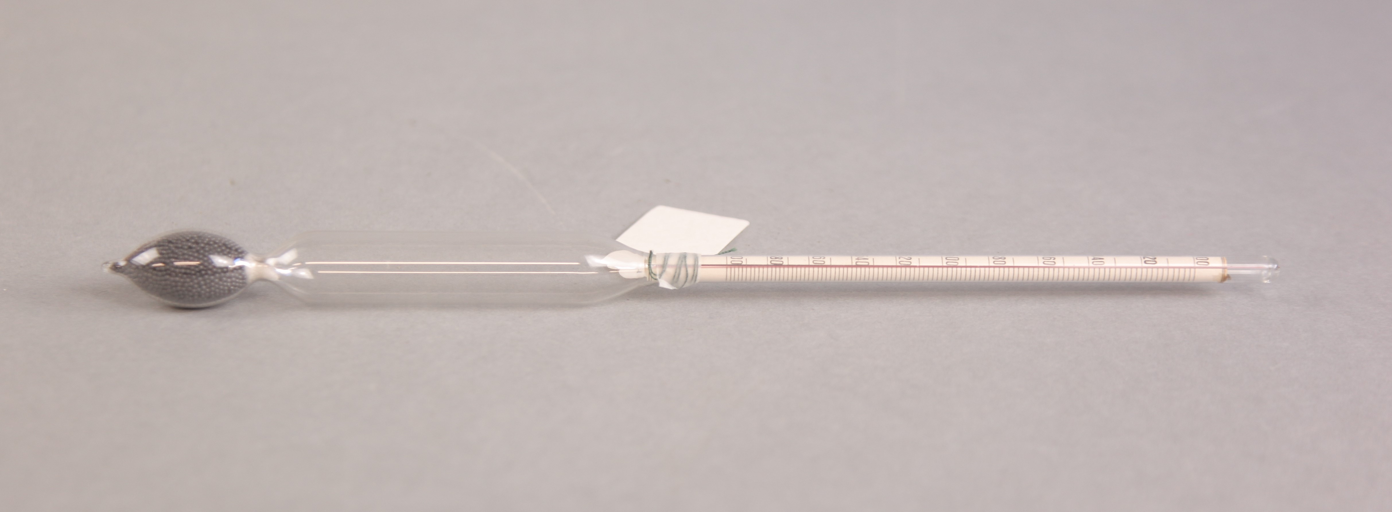 | Descrição: | Composto por um tubo de vidro perfeitamente cilíndrico apresentando na parte inferior uma ampola e por baixo desta, outra mais pequena terminada em ponta, com chumbo para ficar o centro de gravidade por baixo do centro de impulsão e conservar a haste vertical quando flutua. |
