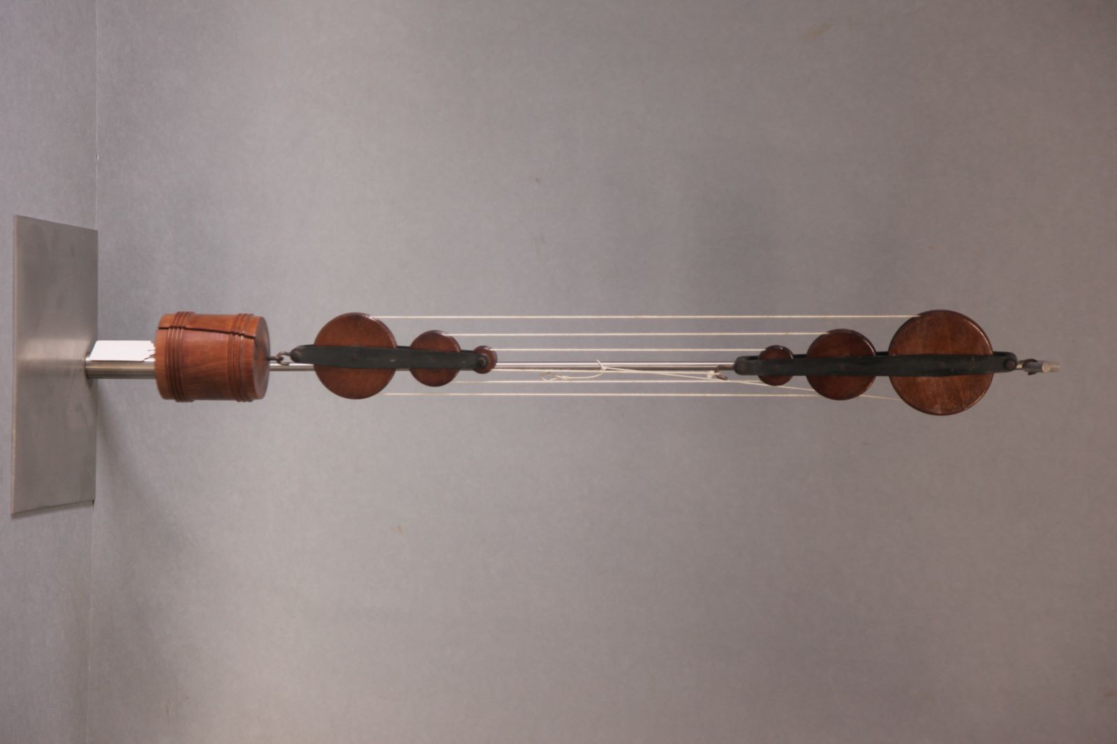 | Finalidade: | Modelo que permitia demonstrar como elevar cargas, utilizando o fator multiplicador 2, sendo o número de roldanas em cada talha. |
