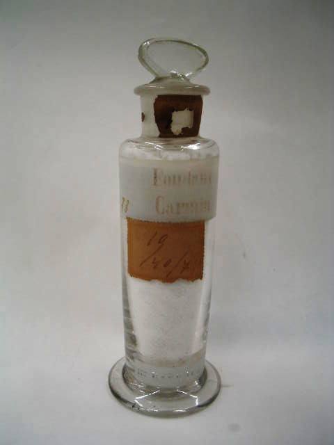 | Descrição: | Frasco de vidro de boca larga e rolha esmerilada com etiqueta vitrificada, contendo no seu interior substância utilizada em experiências no laboratório quimico. |