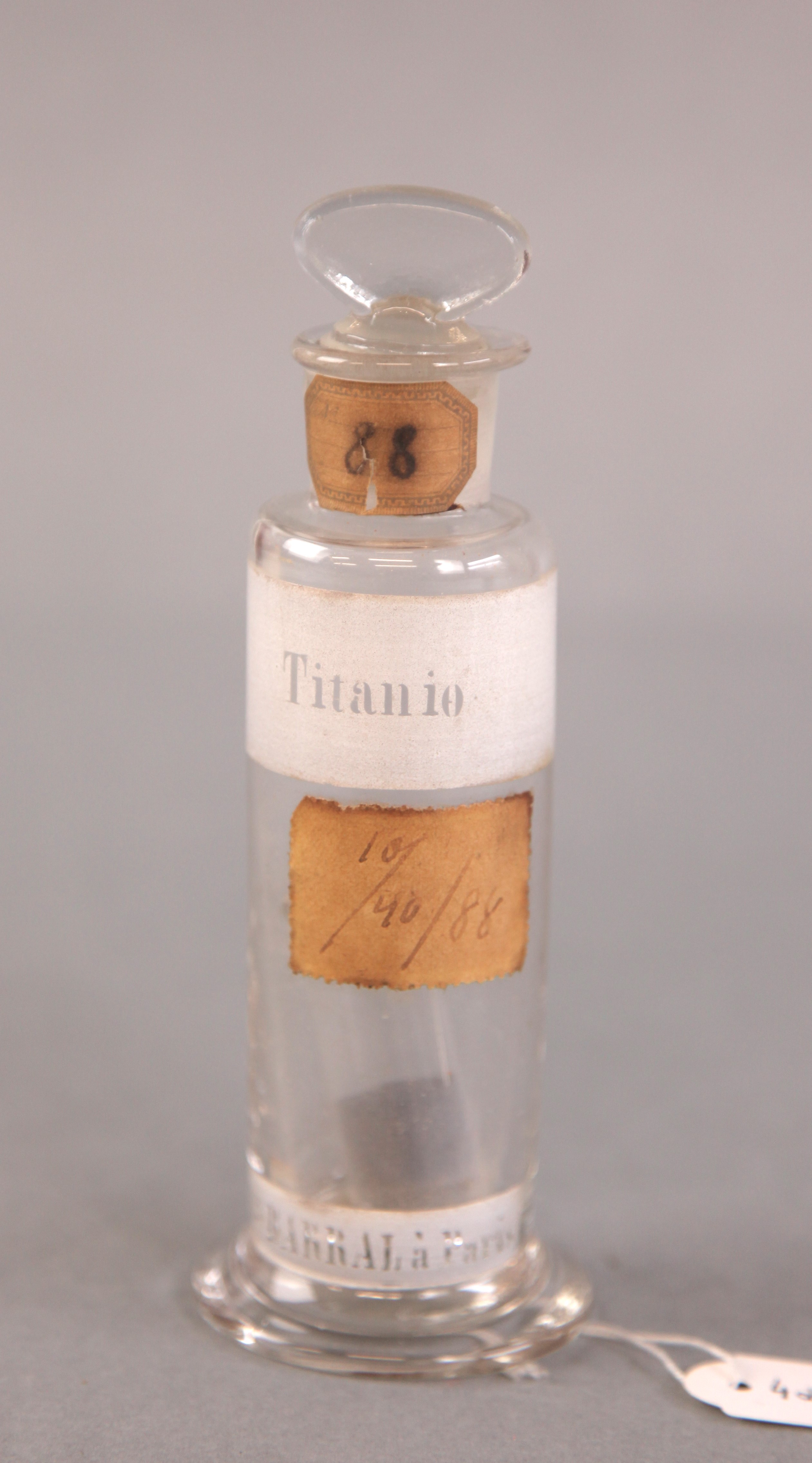 | Descrição: | Frasco de vidro de boca larga e rolha esmerilada com etiqueta vitrificada, contendo no seu interior substância utilizada em experiências no laboratório quimico. |