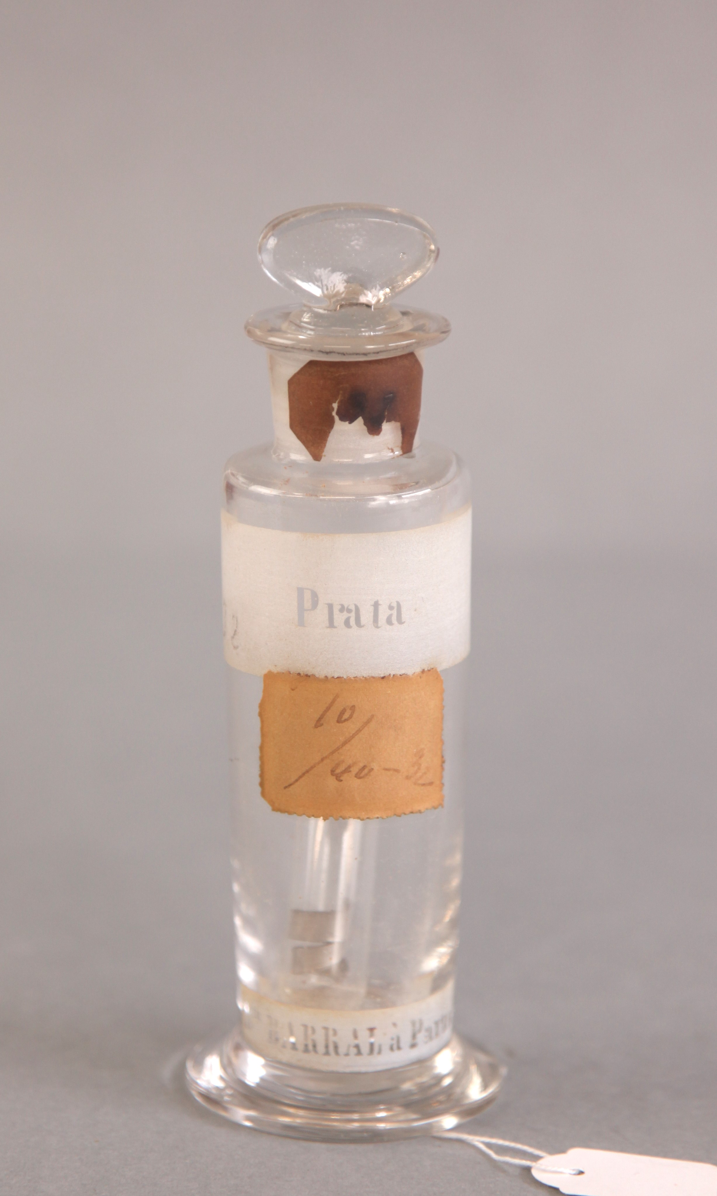 | Descrição: | Frasco de vidro de boca larga e rolha esmerilada com etiqueta vitrificada, contendo no seu interior substância utilizada em experiências no laboratório quimico. |