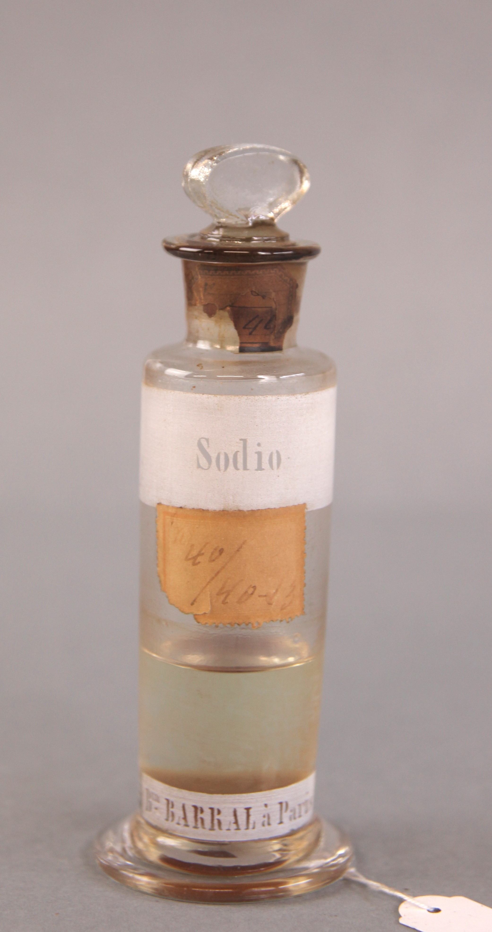 | Descrição: | Frasco de vidro de boca larga e rolha esmerilada com etiqueta vitrificada, contendo no seu interior substância utilizada em experiências no laboratório quimico. |