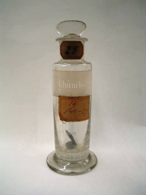 | Descrição: | Frasco de vidro de boca larga e rolha esmerilada com etiqueta vitrificada, contendo no seu interior substância utilizada em experiências no laboratório quimico. |
