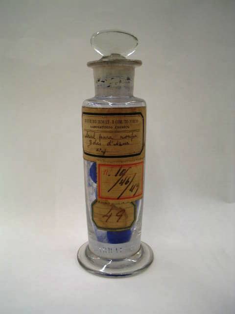 | Descrição: | Frasco de vidro de boca larga e rolha esmerilada com etiqueta vitrificada, contendo no seu interior substância utilizada em experiências no laboratório quimico. |