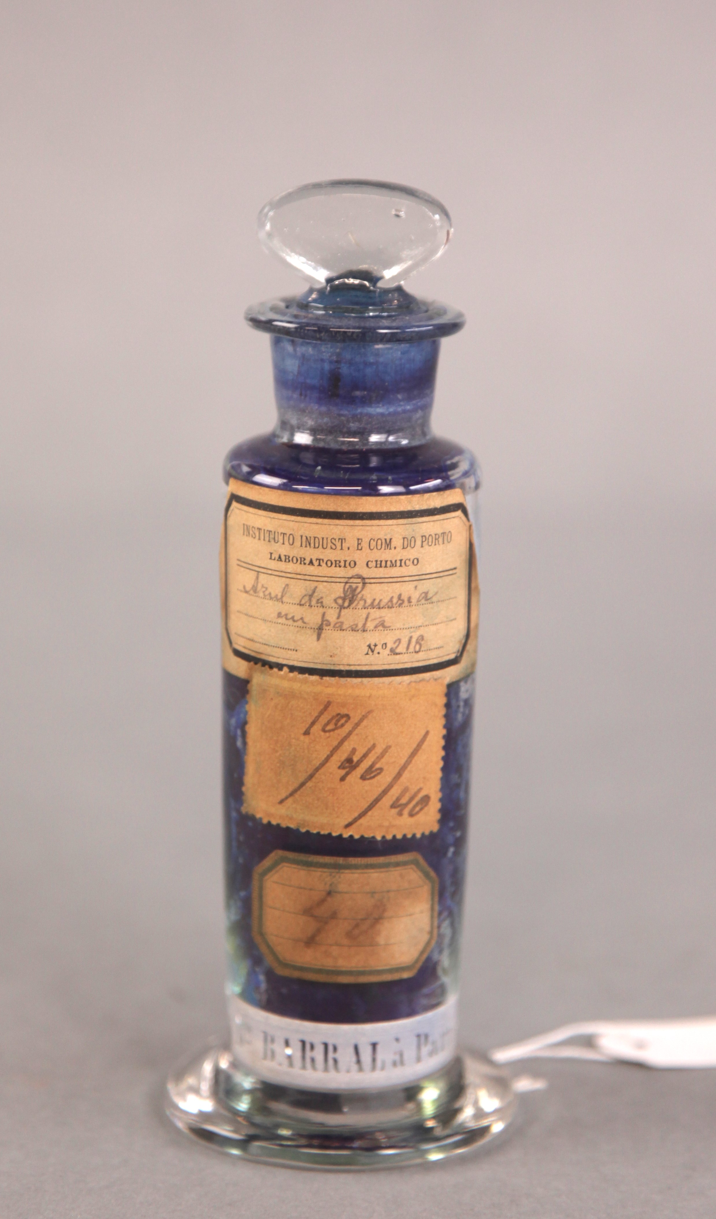 | Descrição: | Frasco de vidro de boca larga e rolha esmerilada com etiqueta vitrificada, contendo no seu interior substância utilizada em experiências no laboratório quimico. |