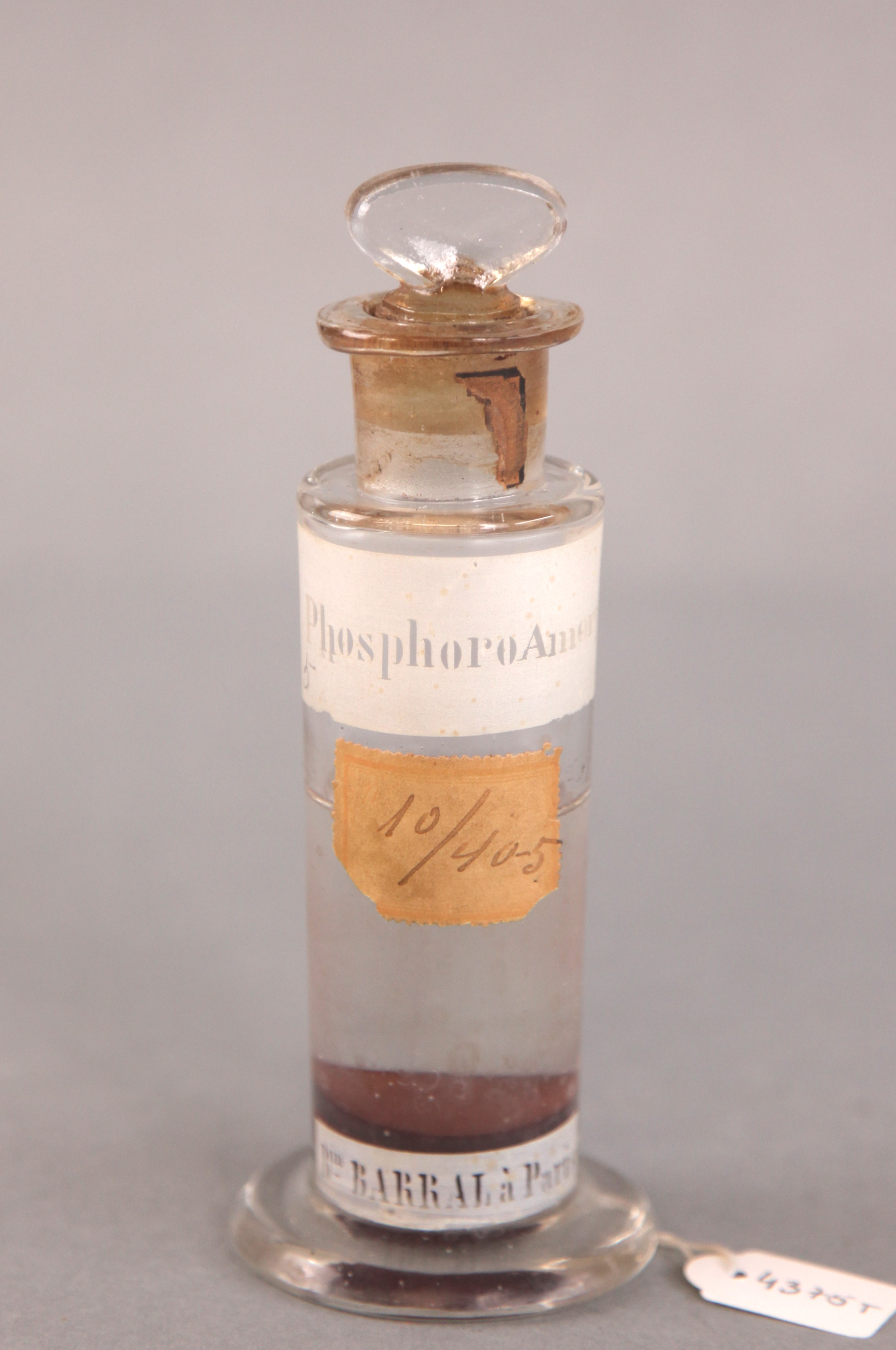| Descrição: | Frasco de vidro de boca larga e rolha esmerilada com etiqueta vitrificada, contendo no seu interior substância utilizada em experiências no laboratório quimico. |