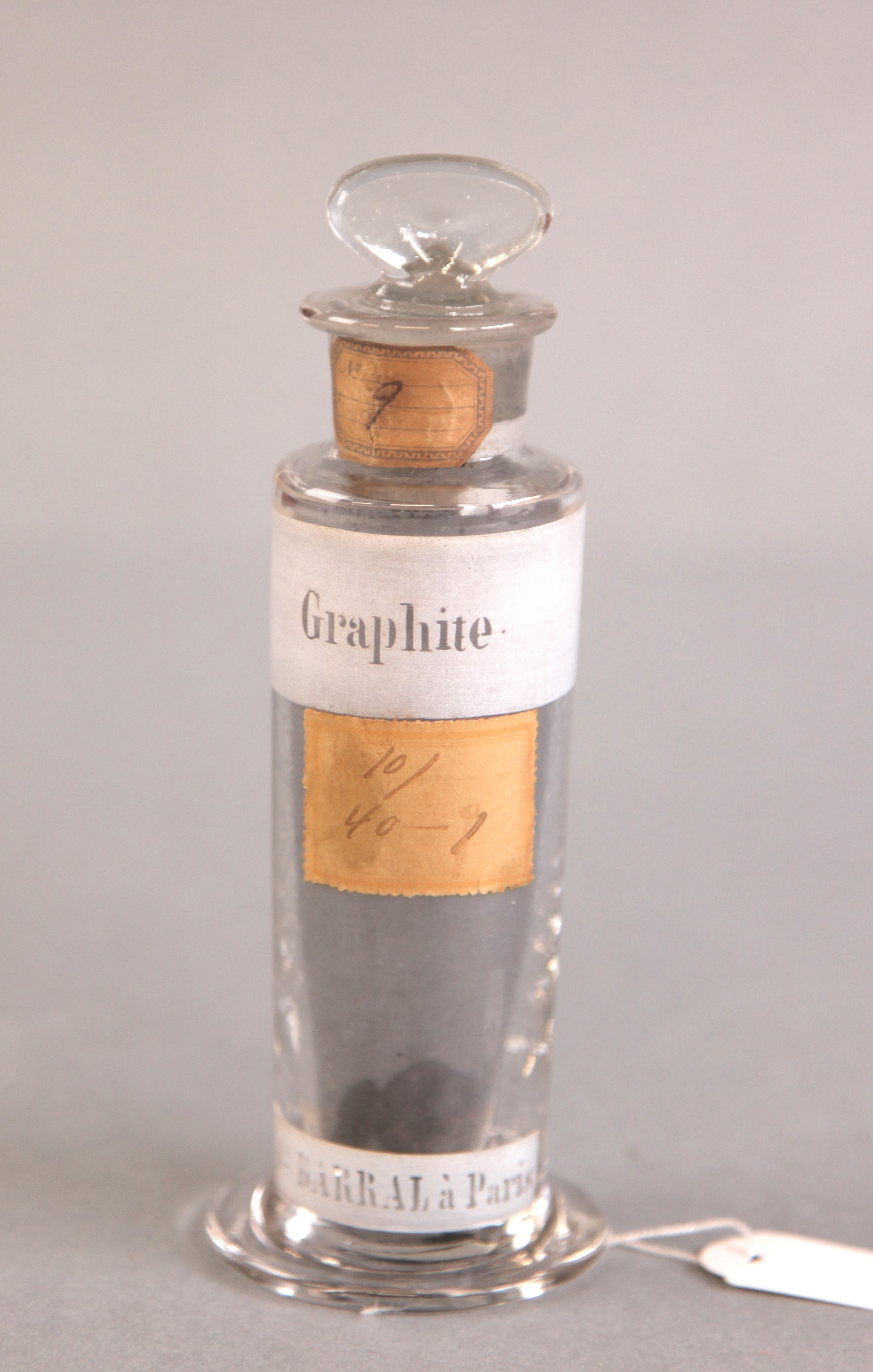 | Descrição: | Frasco de vidro de boca larga e rolha esmerilada com etiqueta vitrificada, contendo no seu interior substância utilizada em experiências no laboratório quimico. |