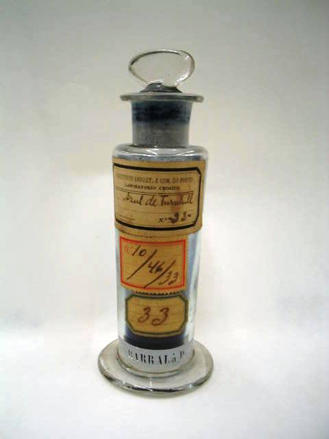 | Descrição: | Frasco de vidro de boca larga e rolha esmerilada com etiqueta vitrificada, contendo no seu interior substância utilizada em experiências no laboratório quimico. |