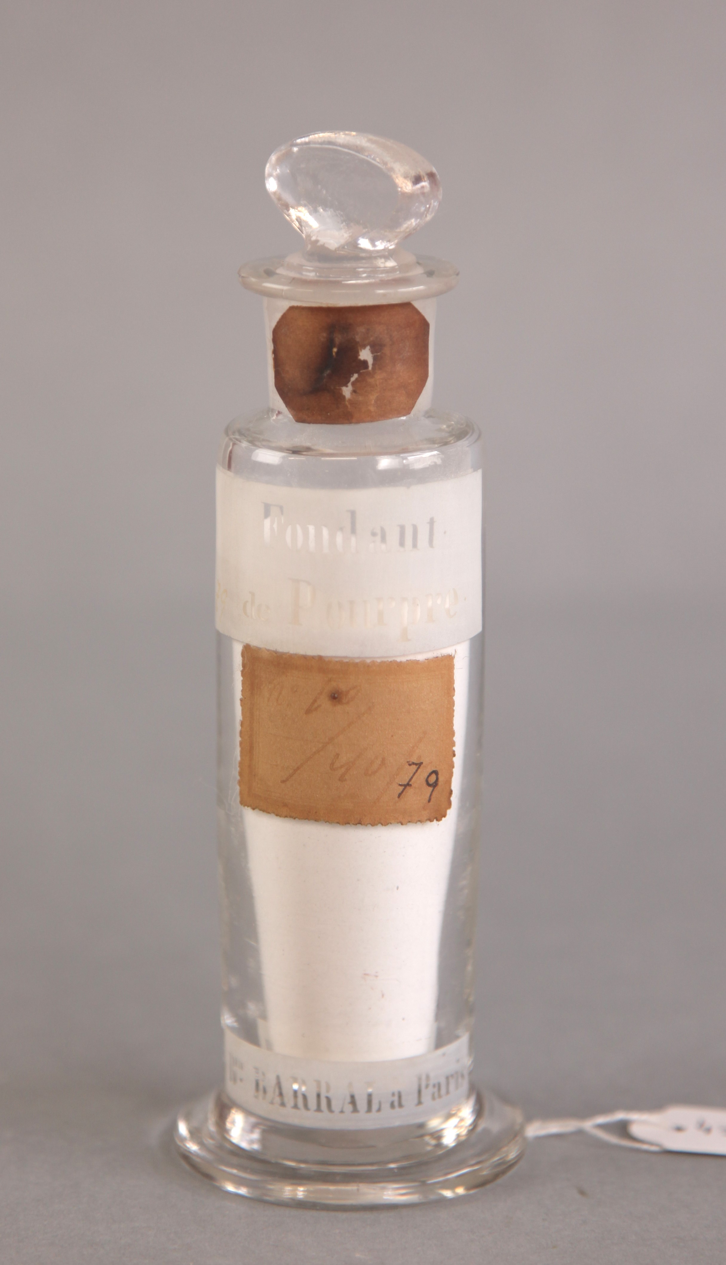 | Descrição: | Frasco de vidro de boca larga e rolha esmerilada com etiqueta vitrificada, contendo no seu interior substância utilizada em experiências no laboratório quimico. |
