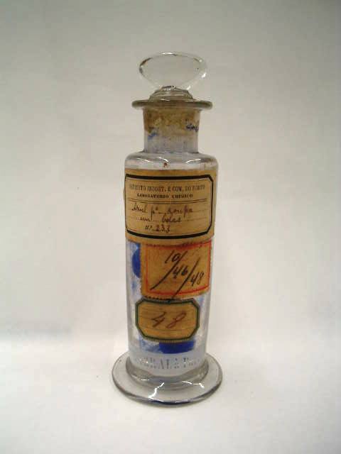 | Descrição: | Frasco de vidro de boca larga e rolha esmerilada com etiqueta vitrificada, contendo no seu interior substância utilizada em experiências no laboratório quimico. |