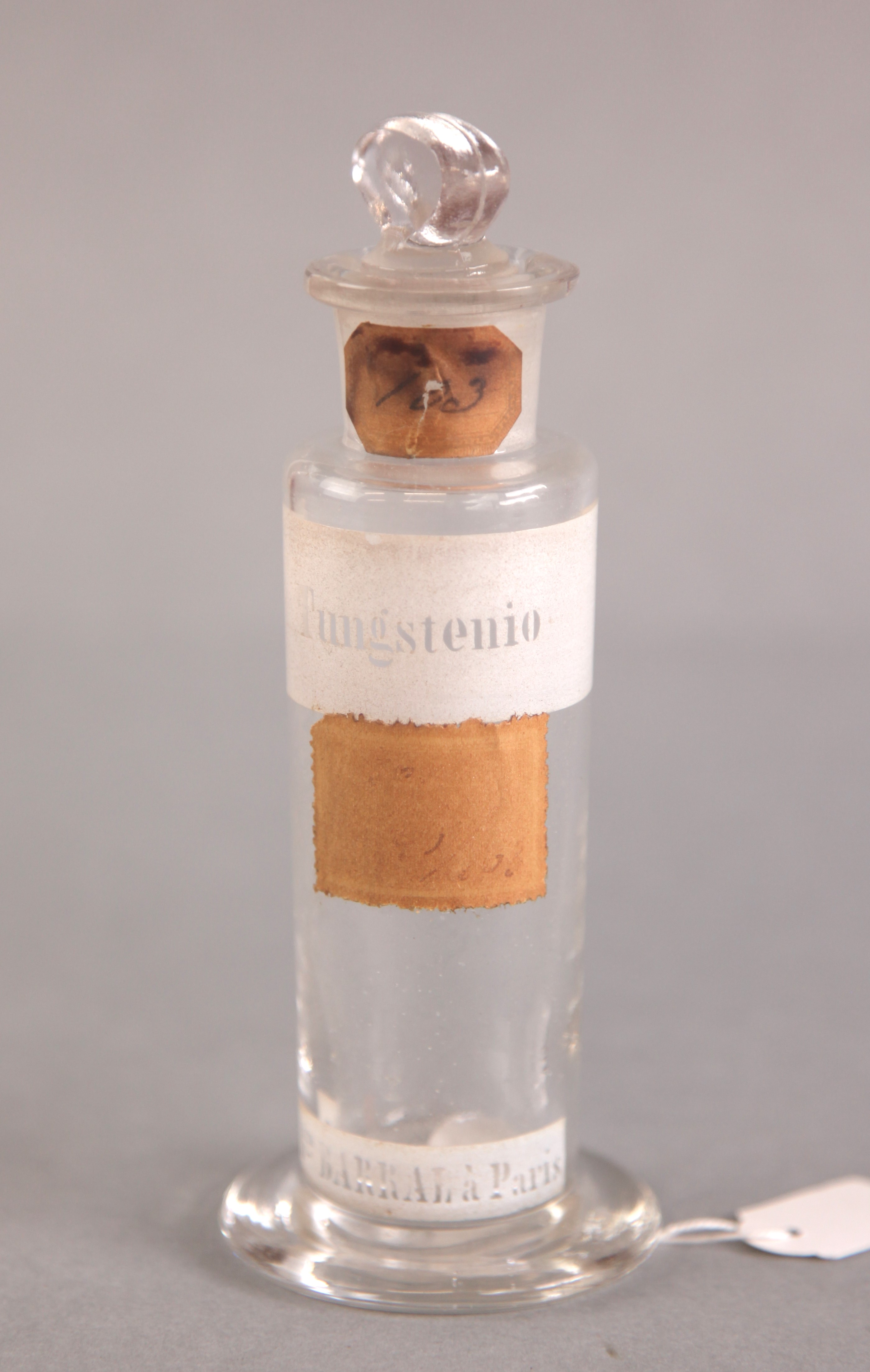 | Descrição: | Frasco de vidro de boca larga e rolha esmerilada com etiqueta vitrificada, contendo no seu interior substância utilizada em experiências no laboratório quimico. |