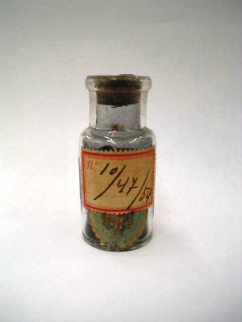 | Descrição: | Frasco de vidro com tampa de cortiça. |