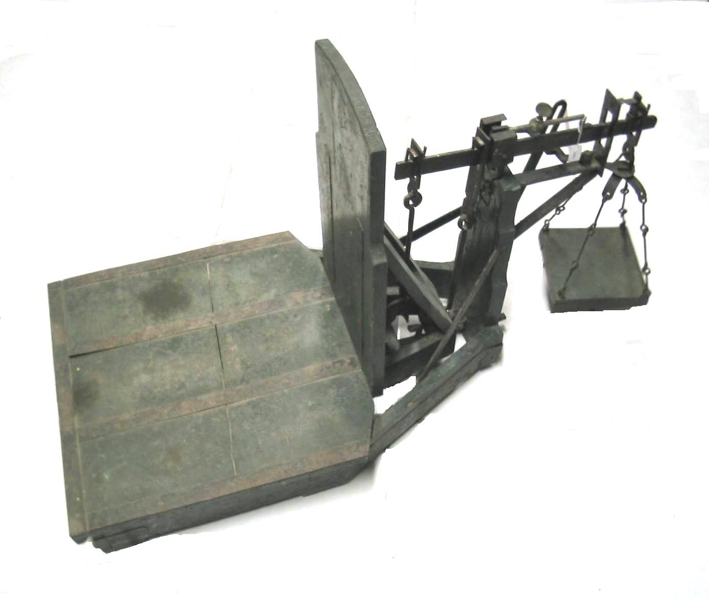 | Descrição: | Composta por um travessão que é constituído por uma dupla alavanca interfixa de braços desiguais. Além do travessão, possui um largo estrado de madeira sobre o qual se colocam os corpos que se pretende pesar e dum prato, suspenso na extremidade da dupla alavanca interfixa, que serve para receber os pesos marcados. O estrado apoia-se de uma lado numa espera suspensa e do outro lado apoia-se num cutelo sobre uma nova alavanca inter-resistente colocada por baixo do estrado. |