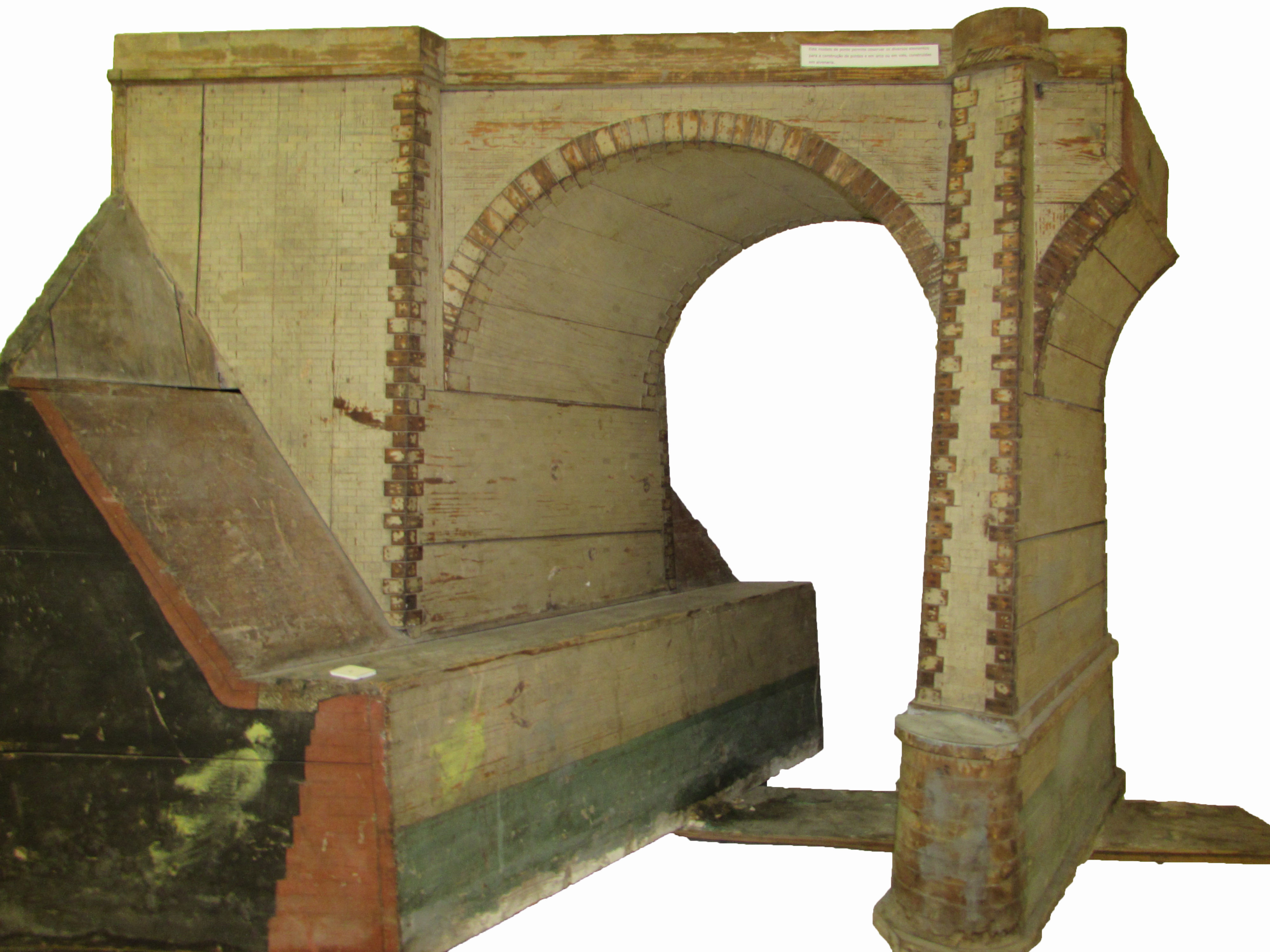 | Descrição: | Modelo de ponte em pedra (em madeira pintada), em viés, sustentado por uma abóbada de berço (semicírculo que sustenta a ponte). |