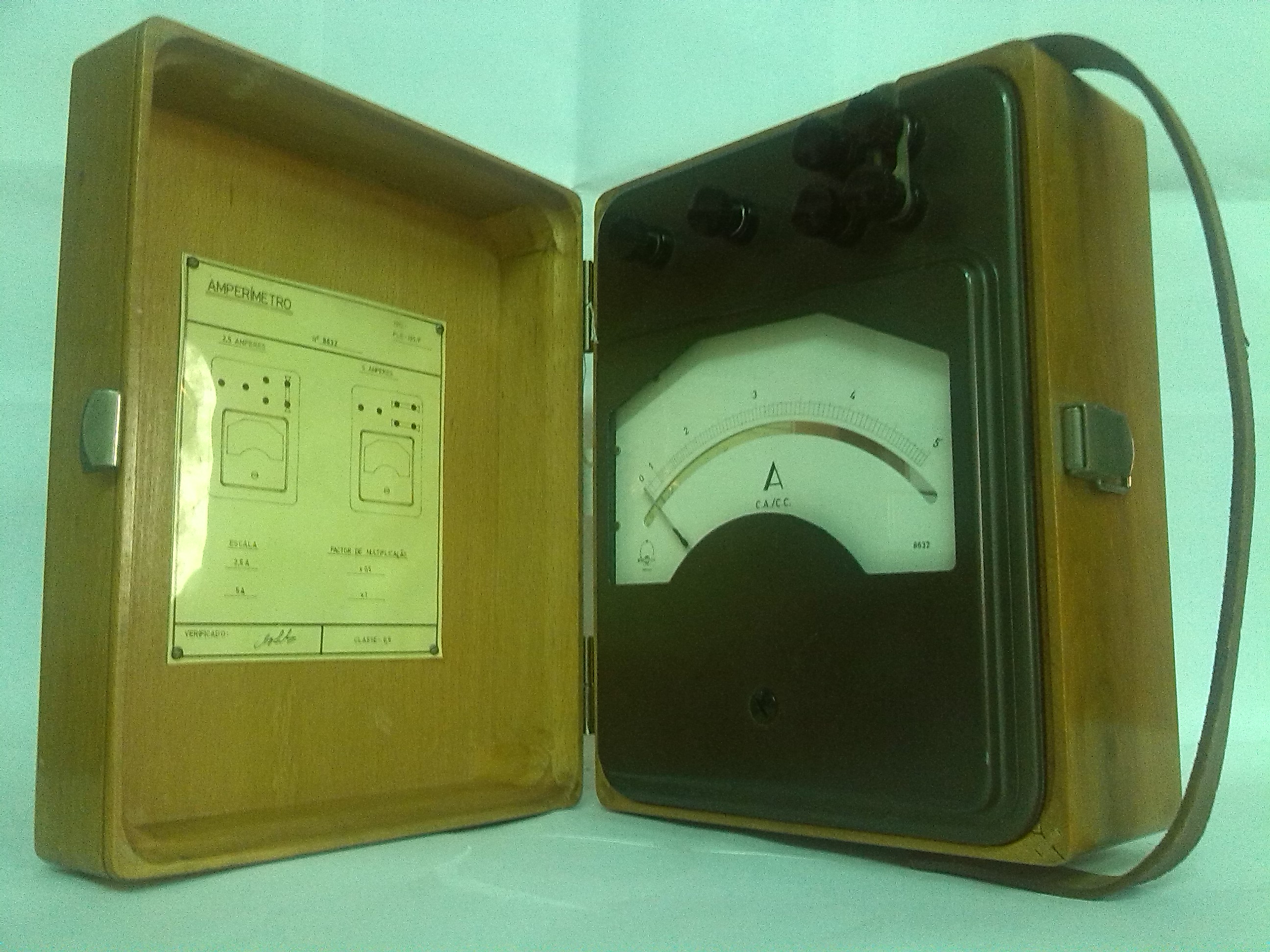 Composto por uma caixa de madeira, com uma pega em couro. O próprio apresenta-se como uma caixa em ferro que possui um mostrador protegido por um vidro, com um leitor das escala. Apresenta duas escalas, uma delas com o intervalo de 0 a 2.5 amperímetros, a segunda de 0 a 5 amperímetros. Estras escalas estão representadas por dois grupos de botões rotativos onde o primeiro com apenas dos botões corresponde à escala 2.5A, enquanto que o segundo grupo de botões (com quatro botões), corresponde à escala 5A.