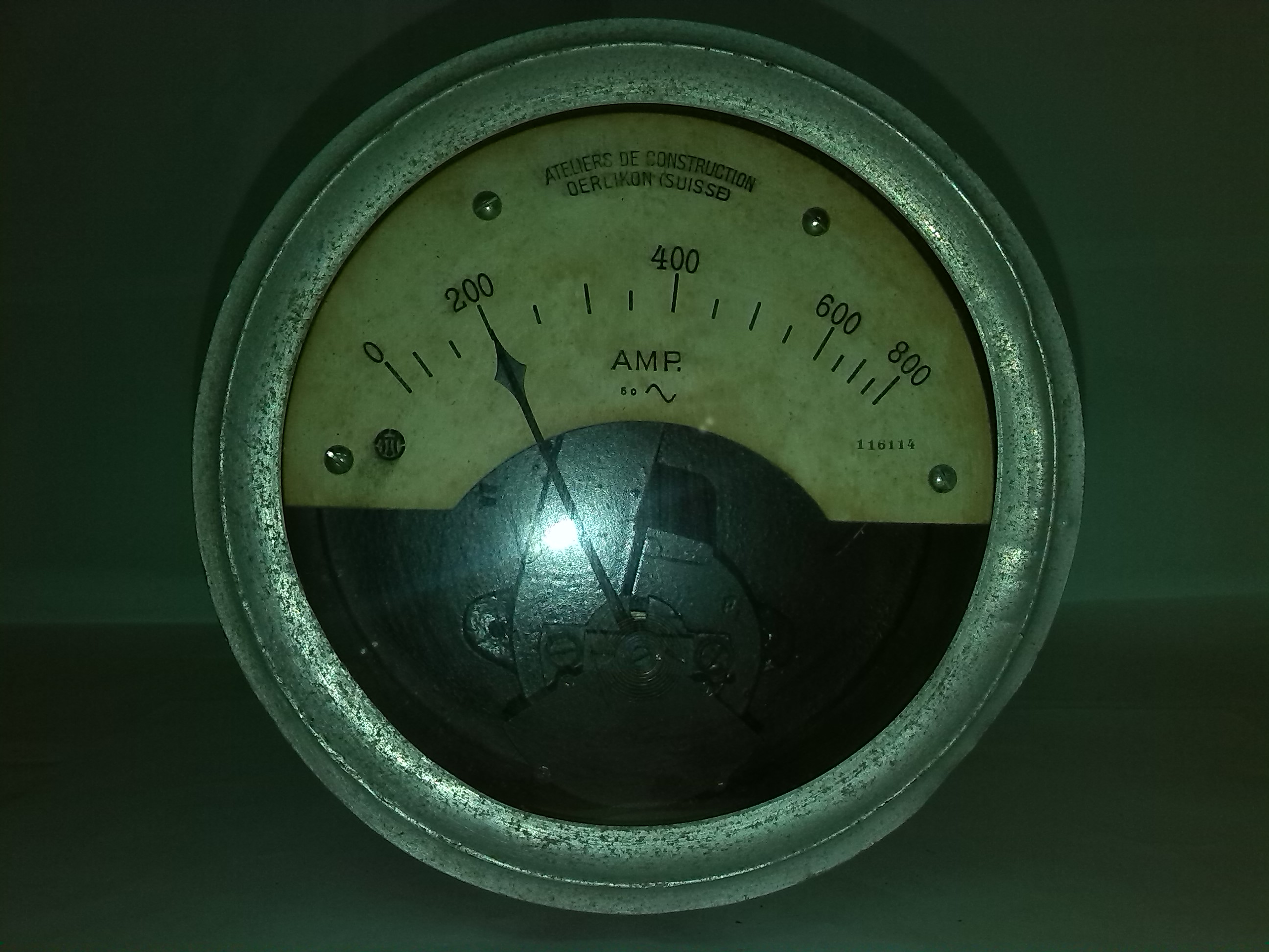 | Descrição: | Aparelho portátil de forma circular. A sua leitura é direta, pois o número de amperes presentes no circuito, onde está inserido em série, é nos dado através de uma escala, que neste exemplo vai dos 0 aos 800 amperes. O valor dos amperes é nos indicados através de um mostrador com um ponteiro, facilitando as leituras em amperes das correntes eléctrica. o amperímetro encontra-se embutido numa estrutura de metal, de maneira a proteger o aparelho. |