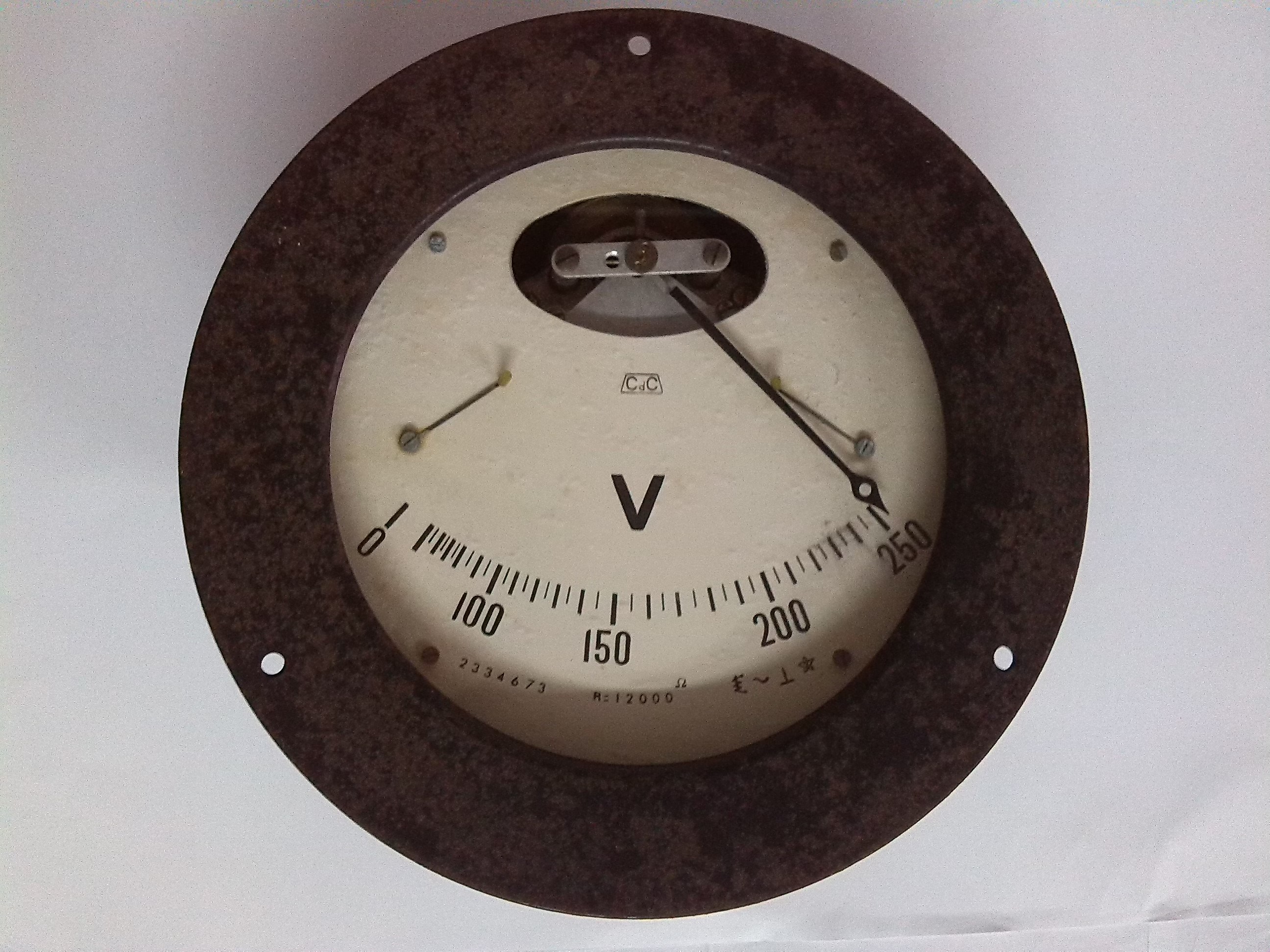 | Descrição: | Composto por um mostrador com uma escala de 0 a 250 volts e respetivo ponteiro, possui uma aplicação para que possa ser pendurado numa parede. |