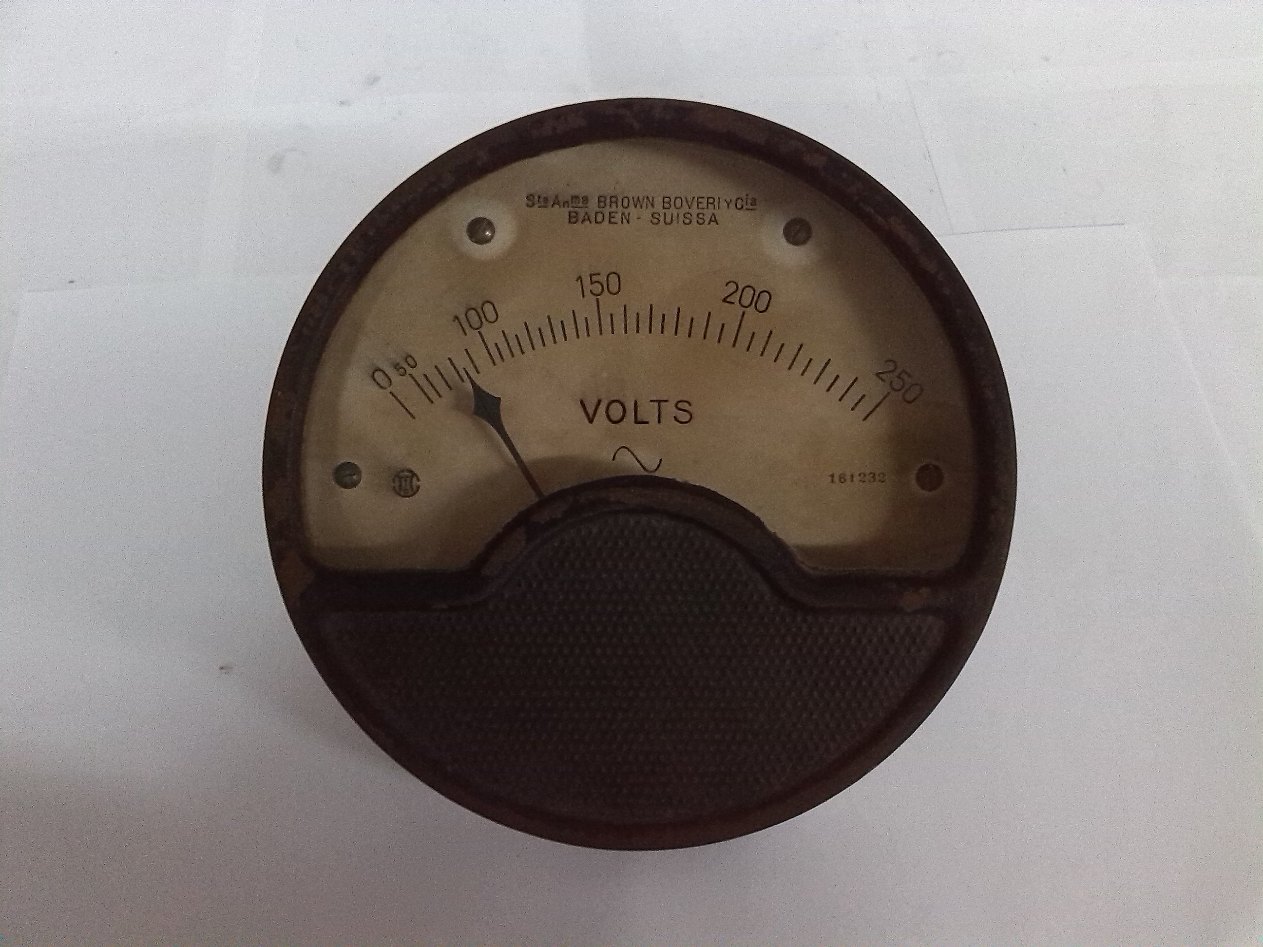 | Descrição: | Composto por um mostrador com uma escala de 0 a 250 volts e respetivo ponteiro, possui uma aplicação para que possa ser pendurado numa parede. |