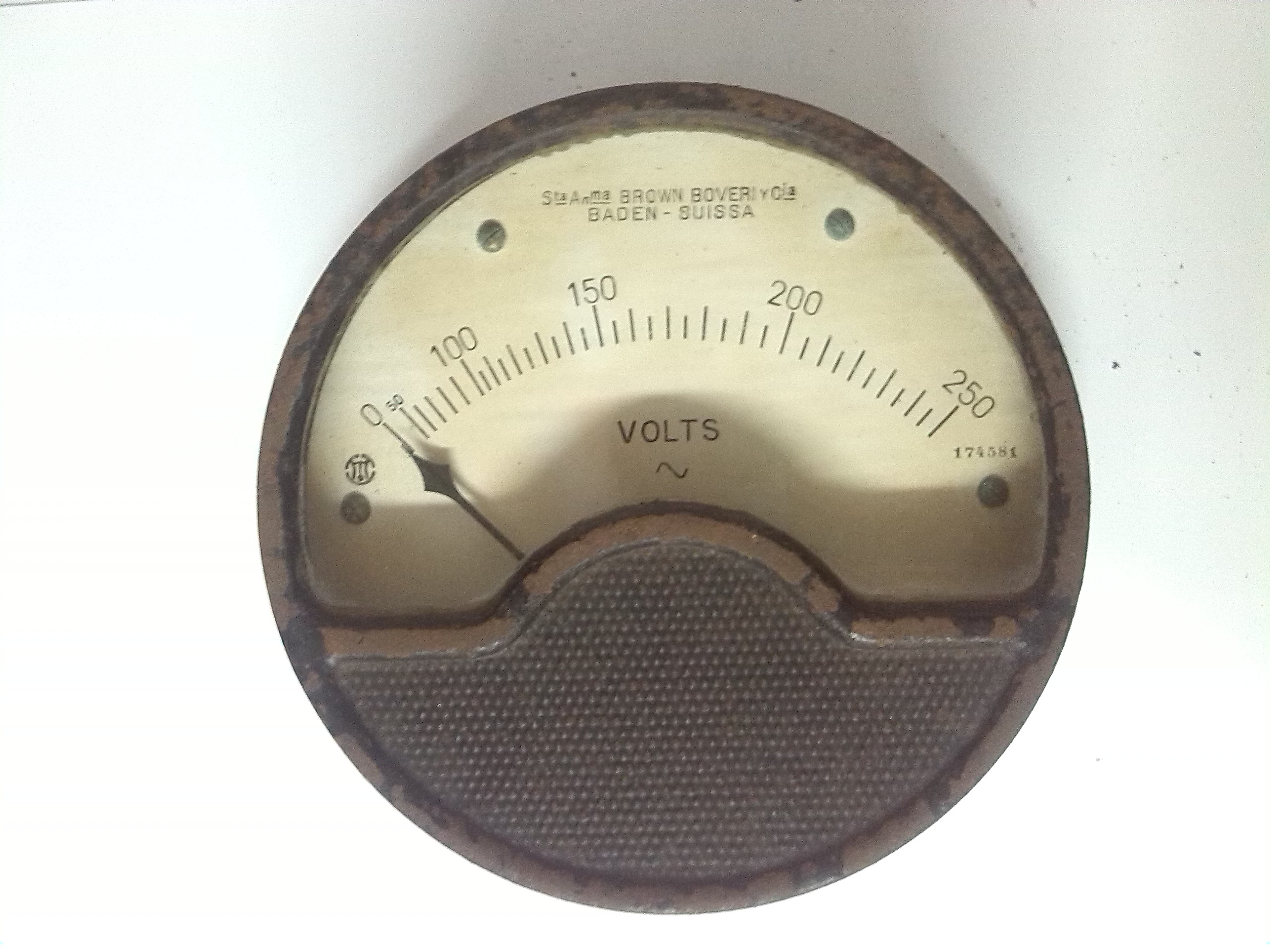 | Descrição: | Composto por um mostrador com uma escala de 0 a 250 volts e respetivo ponteiro, possui uma aplicação para que possa ser pendurado numa parede. |