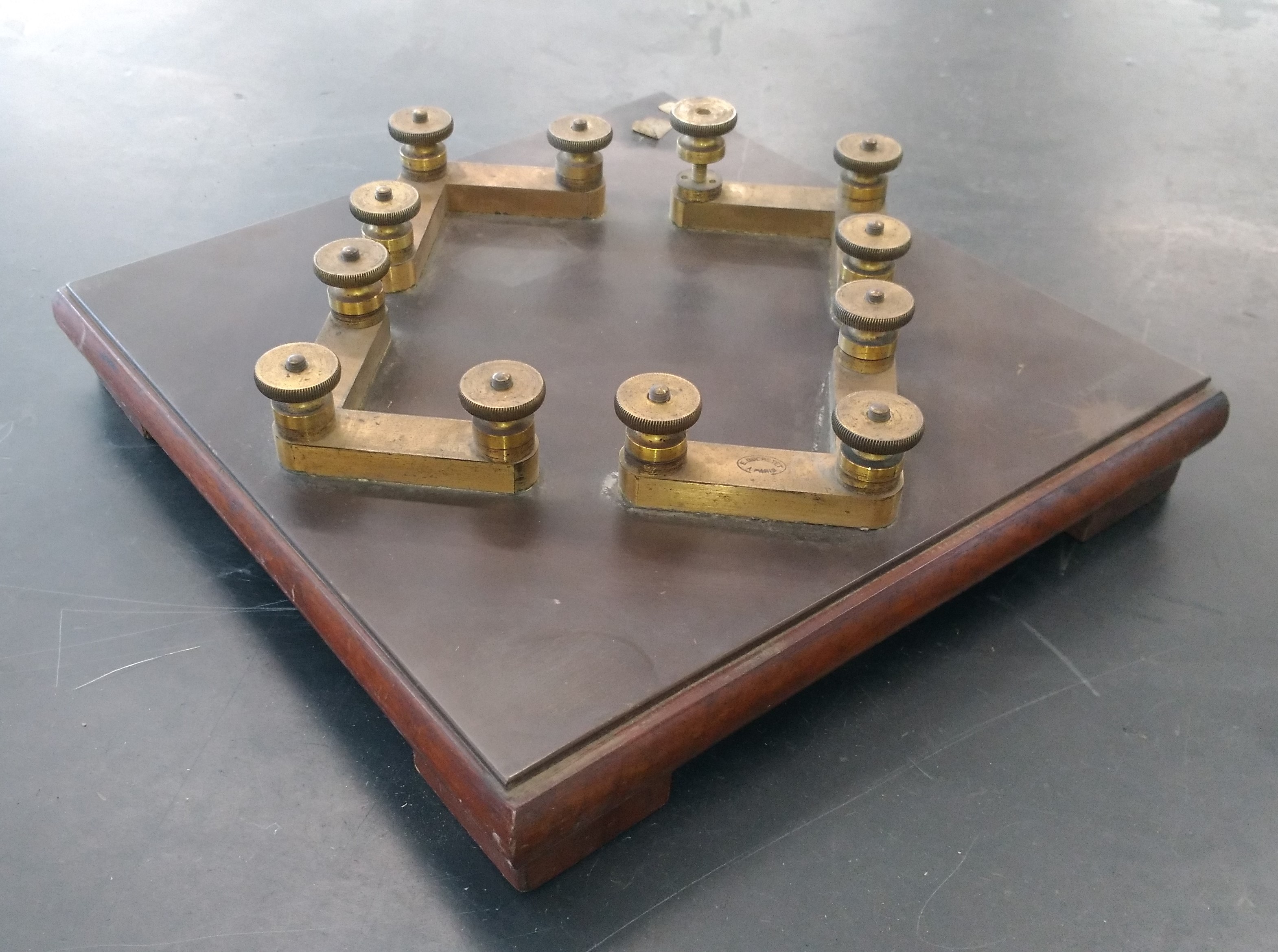 | Descrição: | Modelo clássico, montado sobre uma base de mogno, composto por 4 bandas em latão, colocadas em forma de losango com bornes de contacto onde são colocadas as resistências. |
