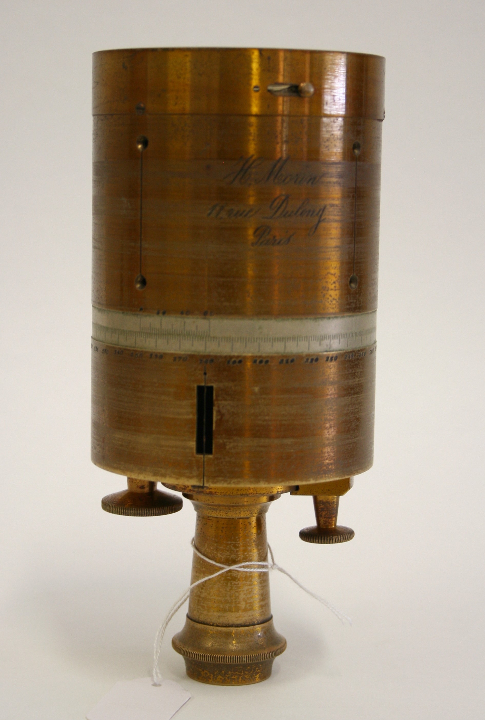 | Descrição: | Composto por dois cilindros sobrepostos no mesmo raio. A parte inferior tem duas aberturas, com cerdas colocadas ao longo da ranhura. O seu topo é graduado de 0 a 360o, correspondendo a zero com uma das aberturas. O cilindro superior pode rodar em relação ao fundo movendo a roda lateral. Tem um nónio que lhe permitia medir ângulos horizontais com precisão de minutos. Duas pínulas opostas determinam um plano perpendicular ao plano determinado pelos outros dois. Tem uma roda inferior que permite nivelar o instrumento. No topo há uma bússola para facilitar a orientação. |
