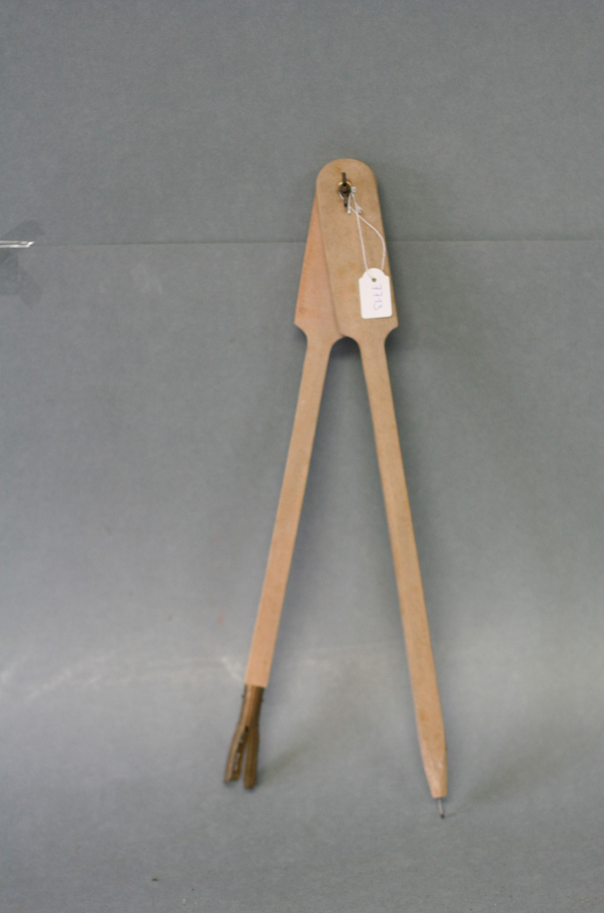 | Descrição: | Composto uma ponta seca, em forma de agulha, que determina um ponto fixo no papel ou no quadro, e outra ponta dotada de um estilete de giz para traçar a circunferência, tendo como centro a ponta seca. |
