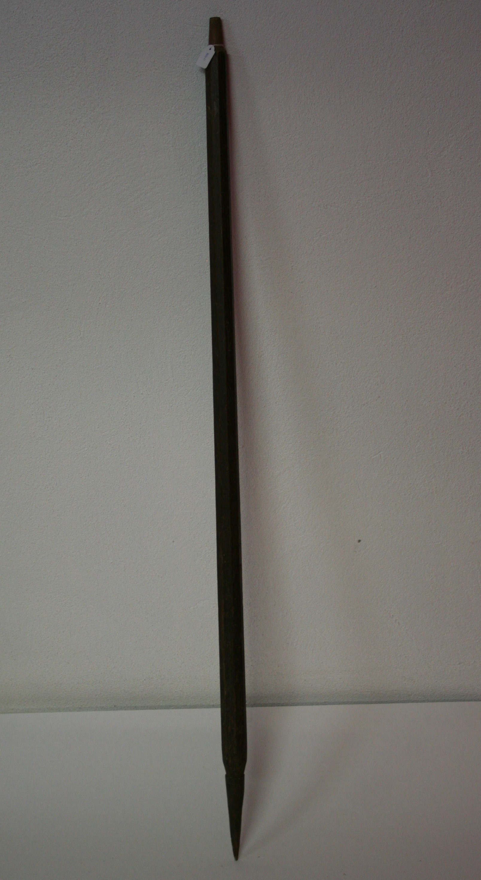| Descrição: | Composto por uma vara em madeira com a extremidade inferior de ferro para facilmente se cravar verticalmente no solo. |