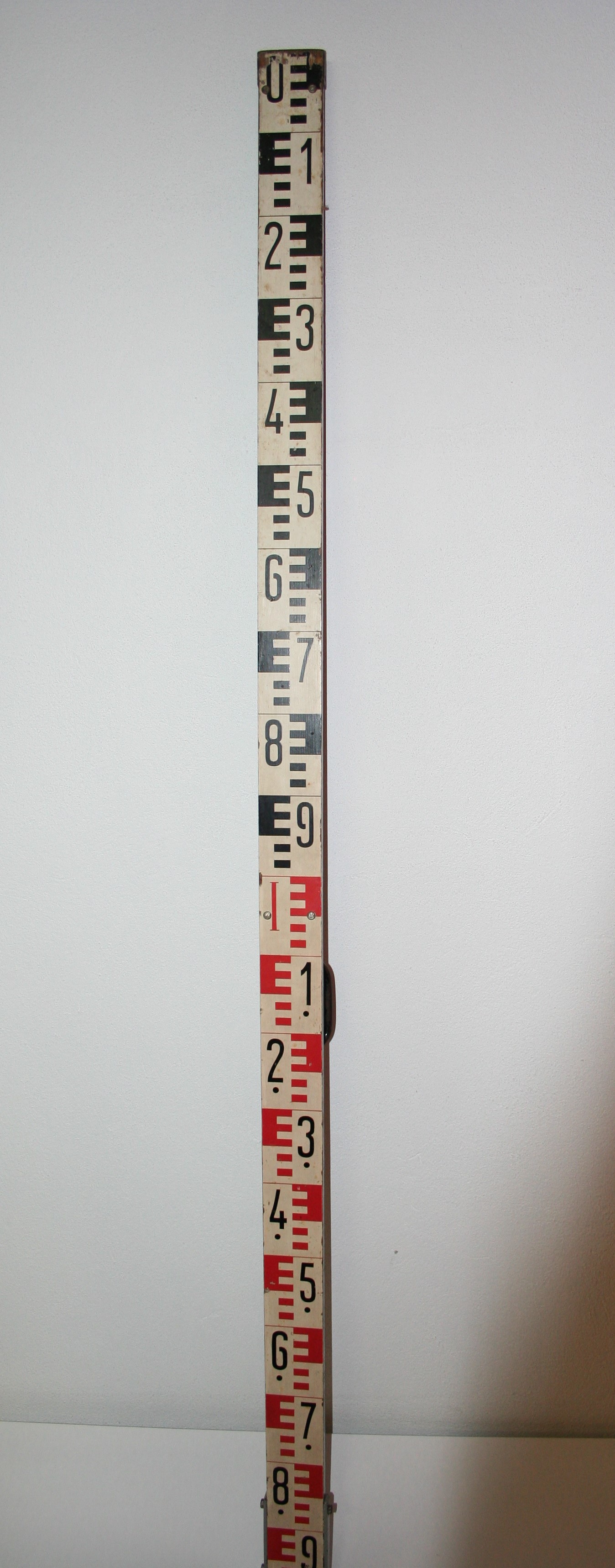 Composta por duas réguas de madeira com 8 a 11 cm de largura e pouco mais de 2 metros cada uma. Estas réguas podem correr ou dobrar-se uma sobre a outra e estão divididas longitudinalmente numa das faces, em três colunas, duas destas indicam os centímetros por meio de pequenas retângulos pintados alternadamente de branco e preto ou vermelho. A 3ª coluna está indicada a numeração em decímetros e em metros por meio de alegorismos.