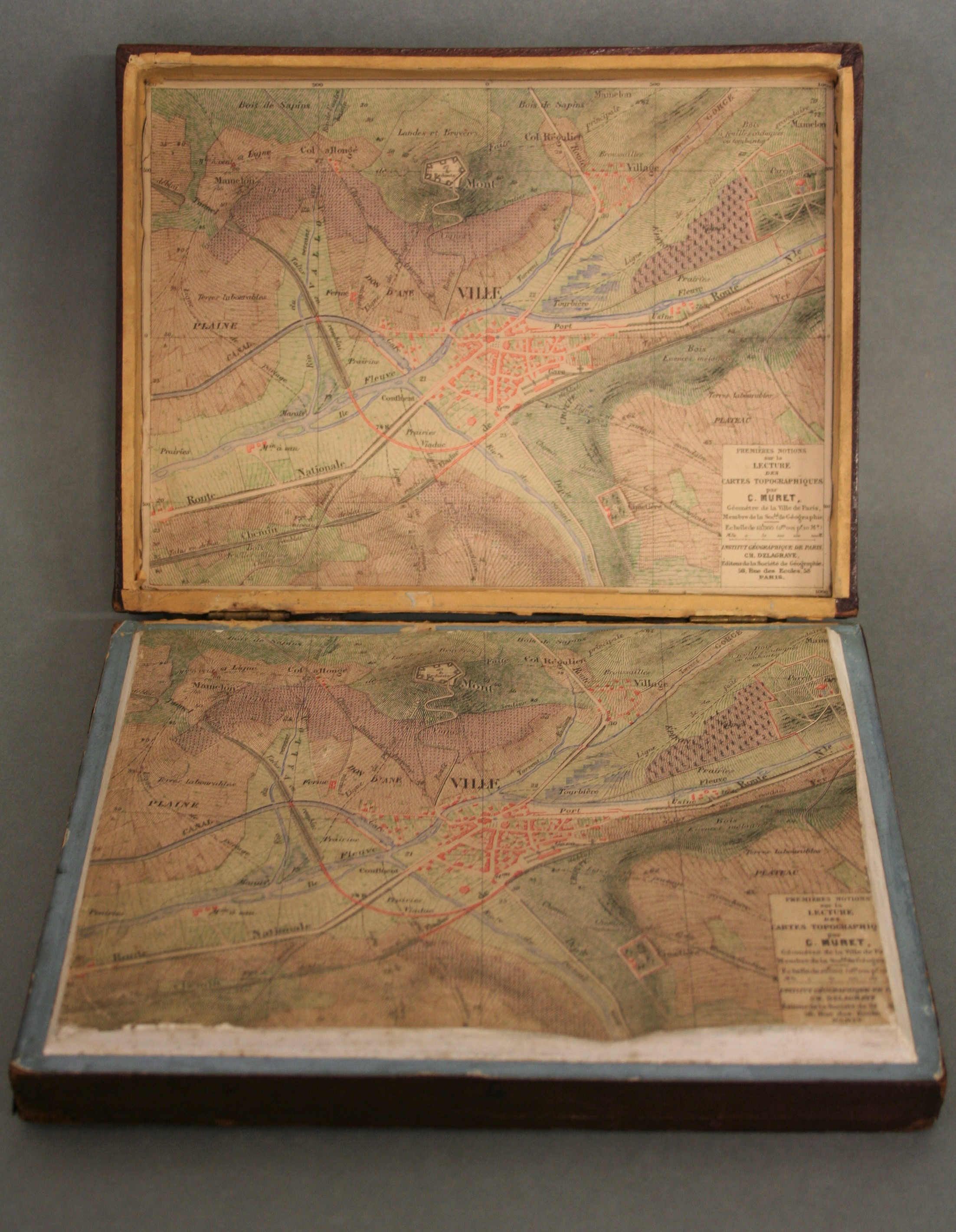 | Denomimaçao Especifica: | Caixa de madeira contendo modelo de topografia em relevo em gesso colorido |