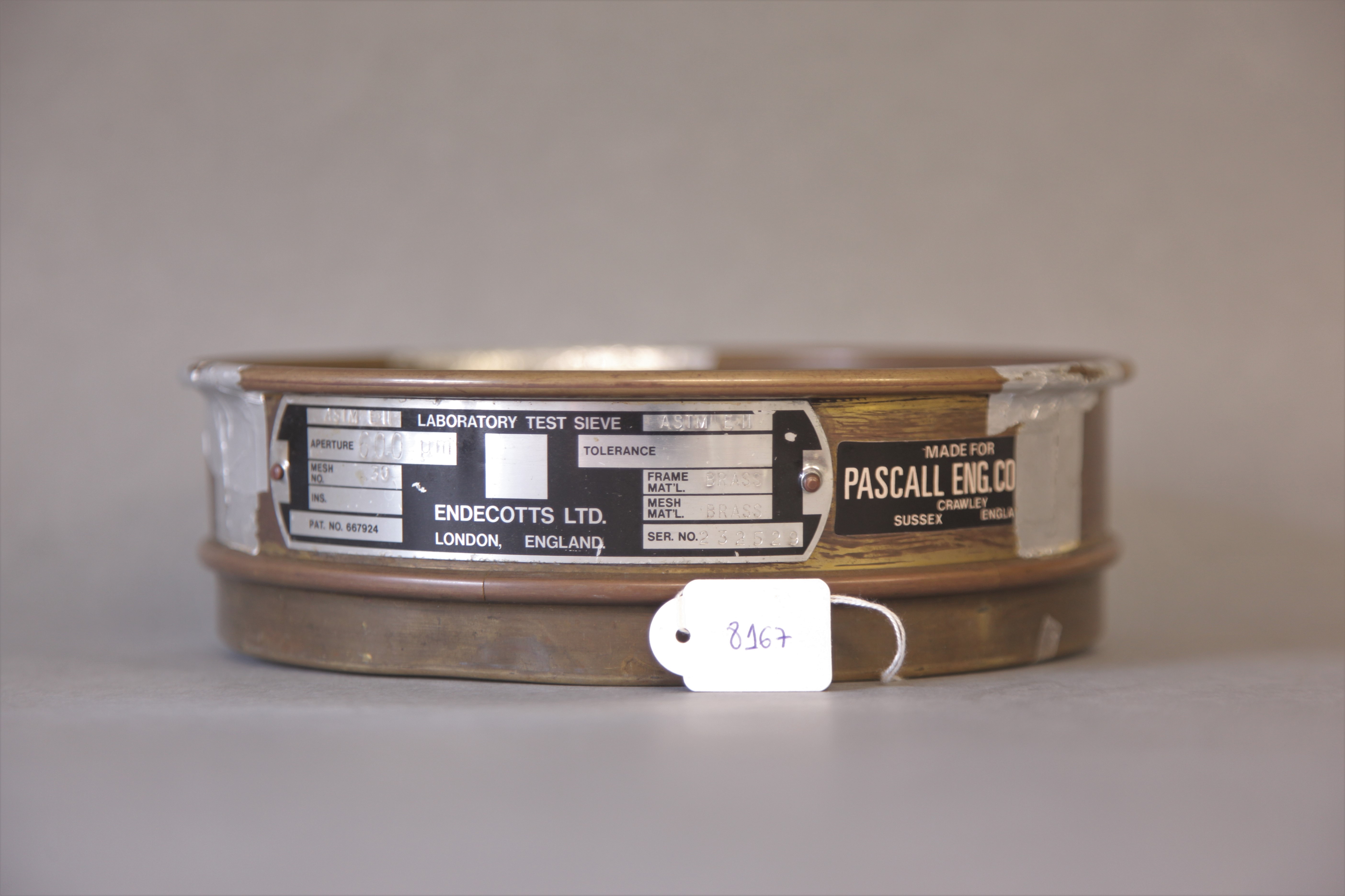 | Observações: | Contém as seguintes informações no objeto: Aperture 600 Mesh No 30 PAT. NO. 667924 FRAME MAT'L BRASS MESH MAT'L BRASS SER. NO. 232529 Made for Pascal Eng. Crawley Sussex England Esta peneira faz parte de um conjunto sendo associada ao Agitador de Peneiras (8165). |