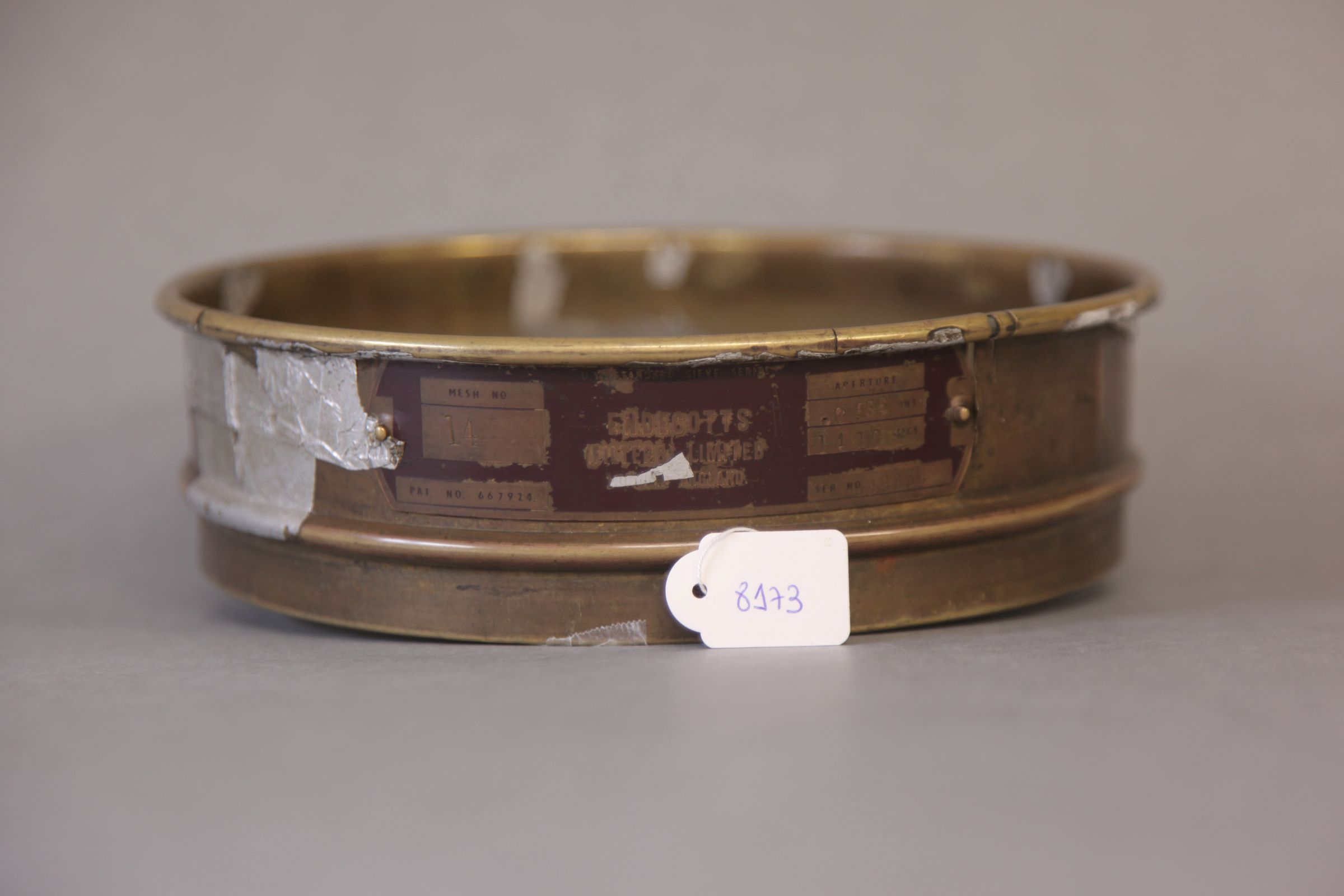 | Observações: | Contém as seguintes informações no objeto: Aperture 0555 INS 1420 MICS Mesh No 14 PAT. NO. 667924 SER. NO. 04963 Esta peneira faz parte de um conjunto sendo associada ao Agitador de Peneiras (8165). |
