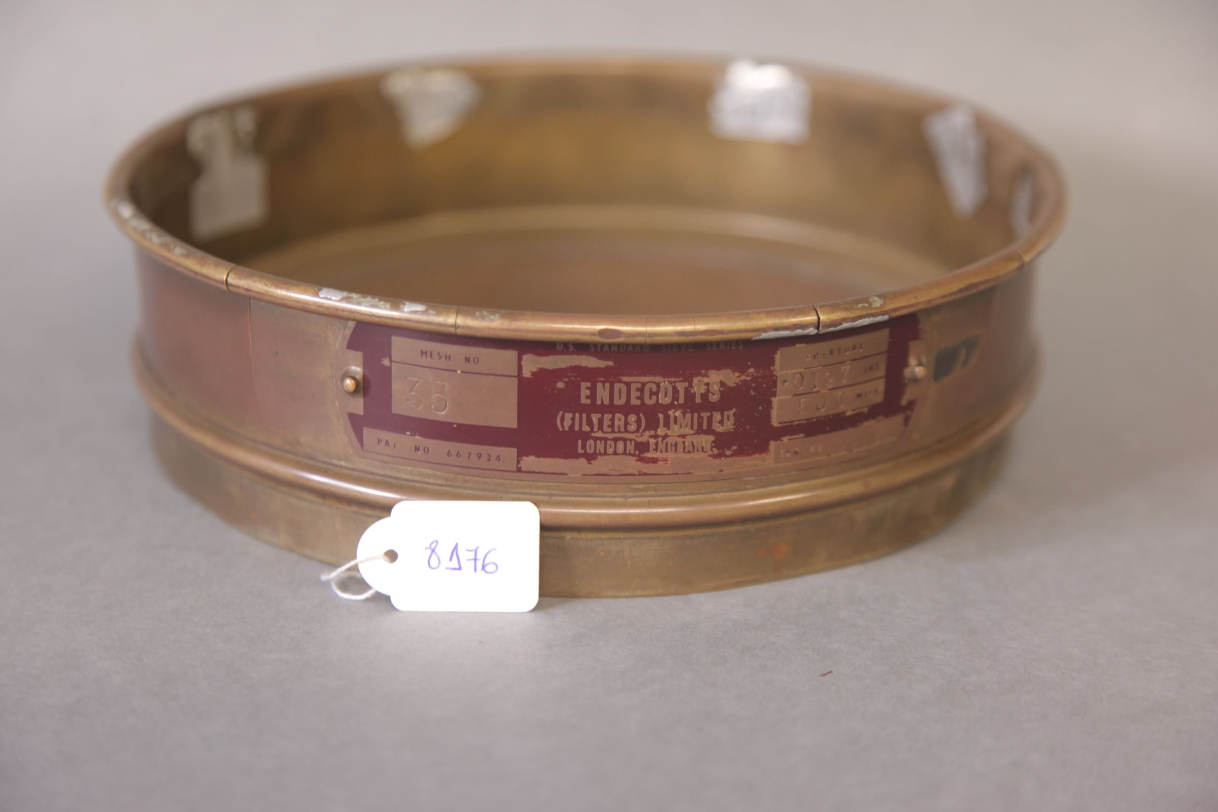 | Observações: | Contém as seguintes informações no objeto: Aperture 0194 INS 500 MICS Mesh No 35 PAT. NO. 667924 SER. NO. 949/9 Esta peneira faz parte de um conjunto sendo associada ao Agitador de Peneiras (8165). |