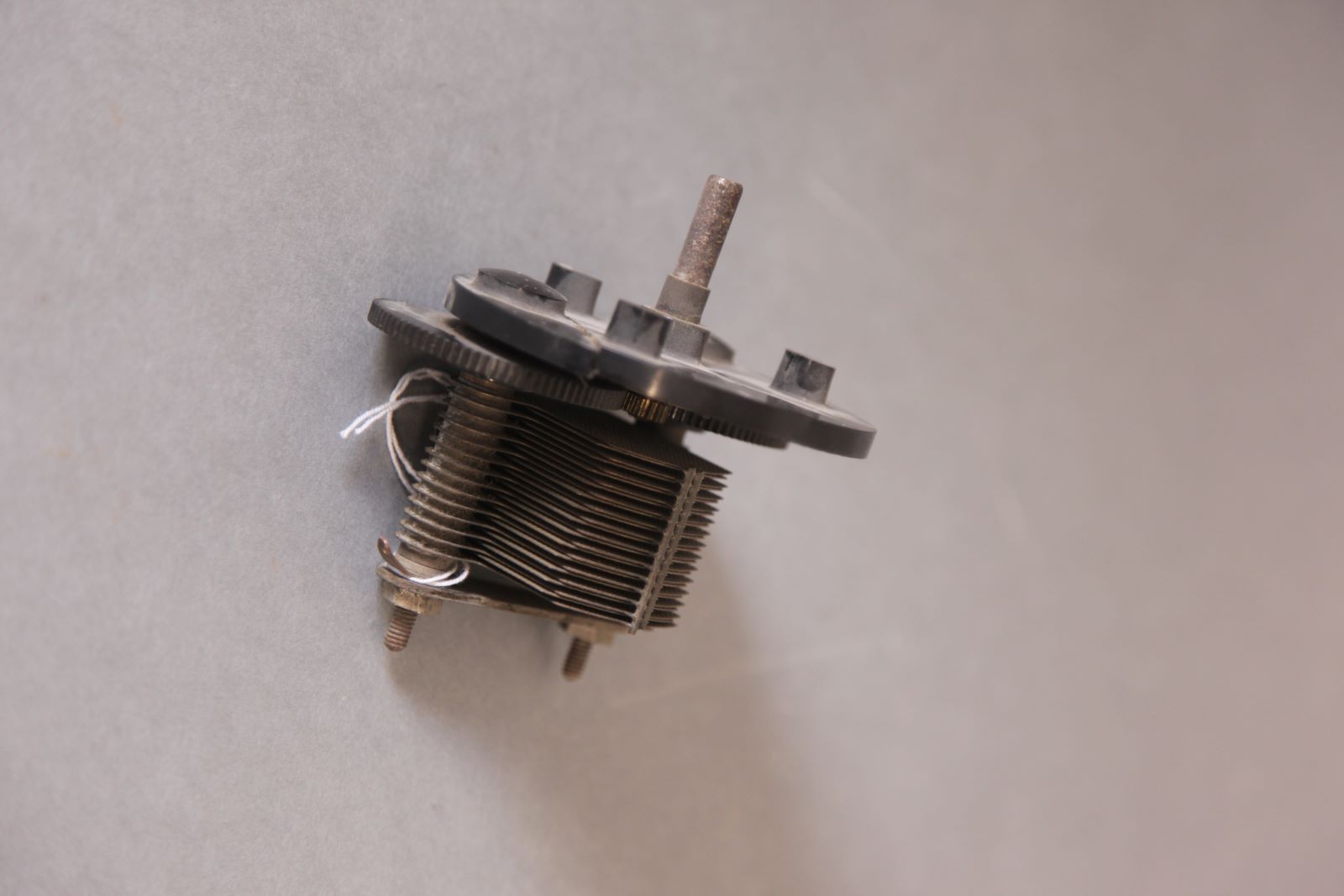 | Descrição: | Composto por um condensador variável duplo com duas engrenagens. O condensador em questão é constituído por diversas placas paralelas fixas e por um rotor, ou seja, é tudo que gira em torno de seu próprio eixo produzindo movimentos de rotação. |