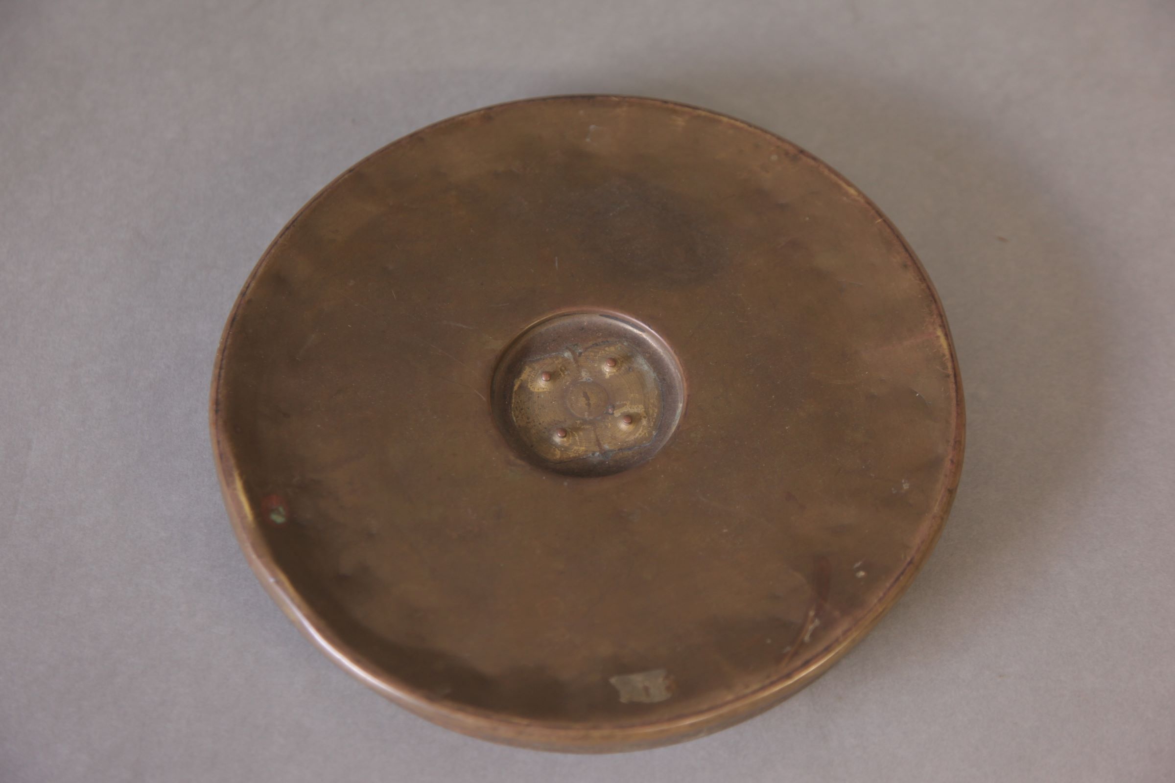 | Descrição: | Carateriza-se pelo seu formato circular sendo feita em latão. No seu centro era suposto ter uma pequena argola que permitia segurar na mesma. |
