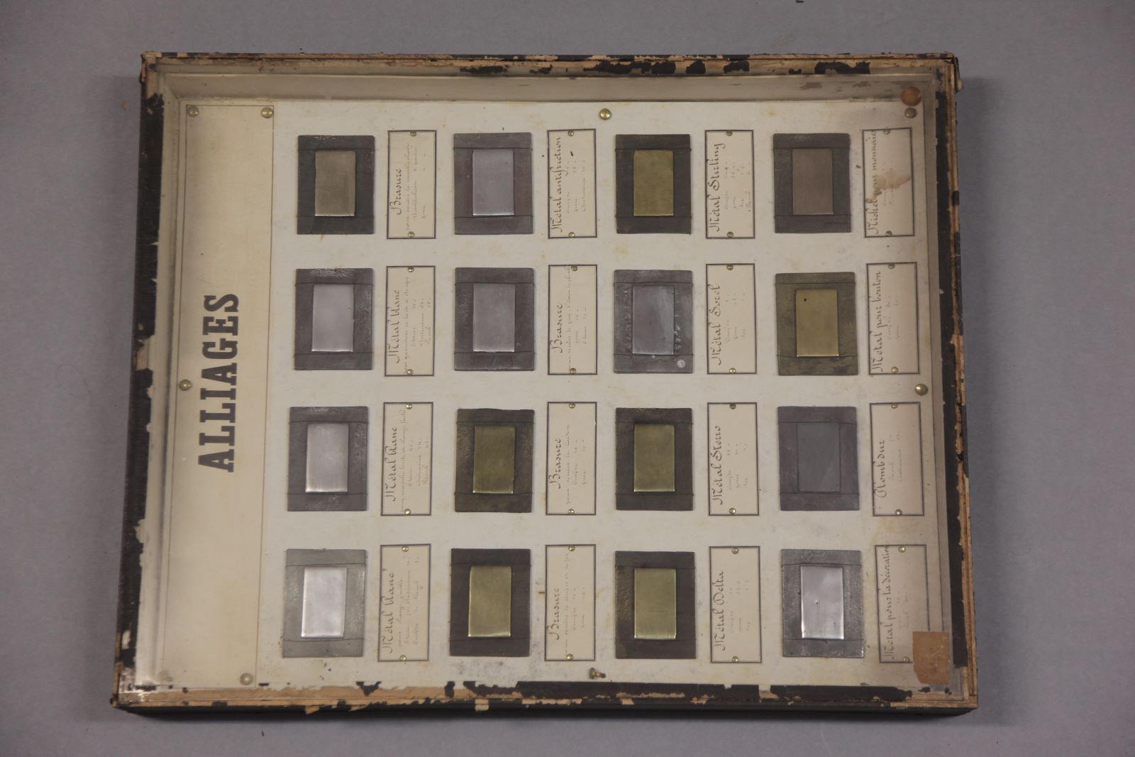 | Descrição: | Quadro com conjunto de amostras de ligas de Deyrolle. |