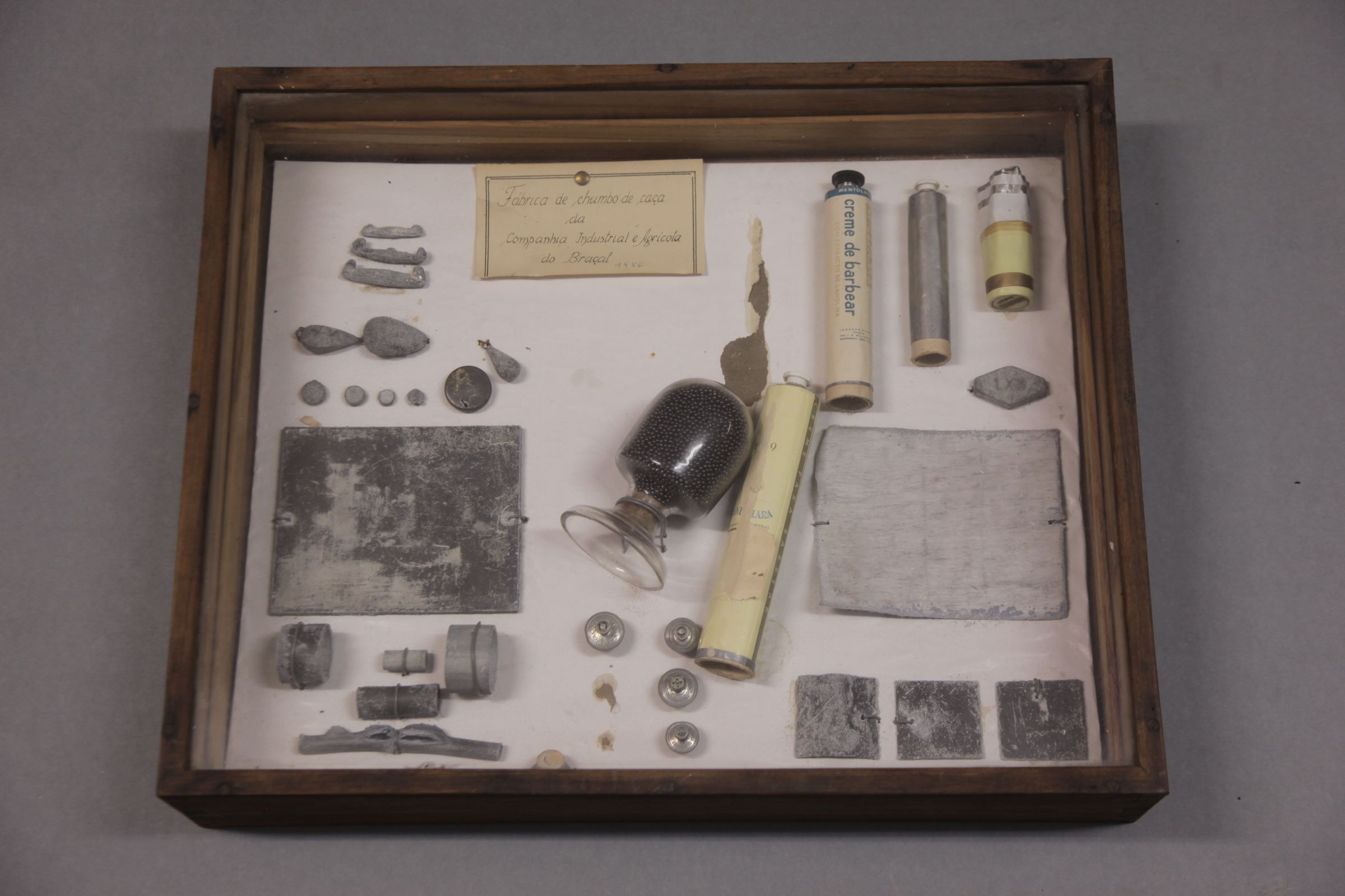 | Descrição: | Quadro com amostras da fábrica de chumbo de caça da Companhia Industrial e Agrícola do Braçal. |