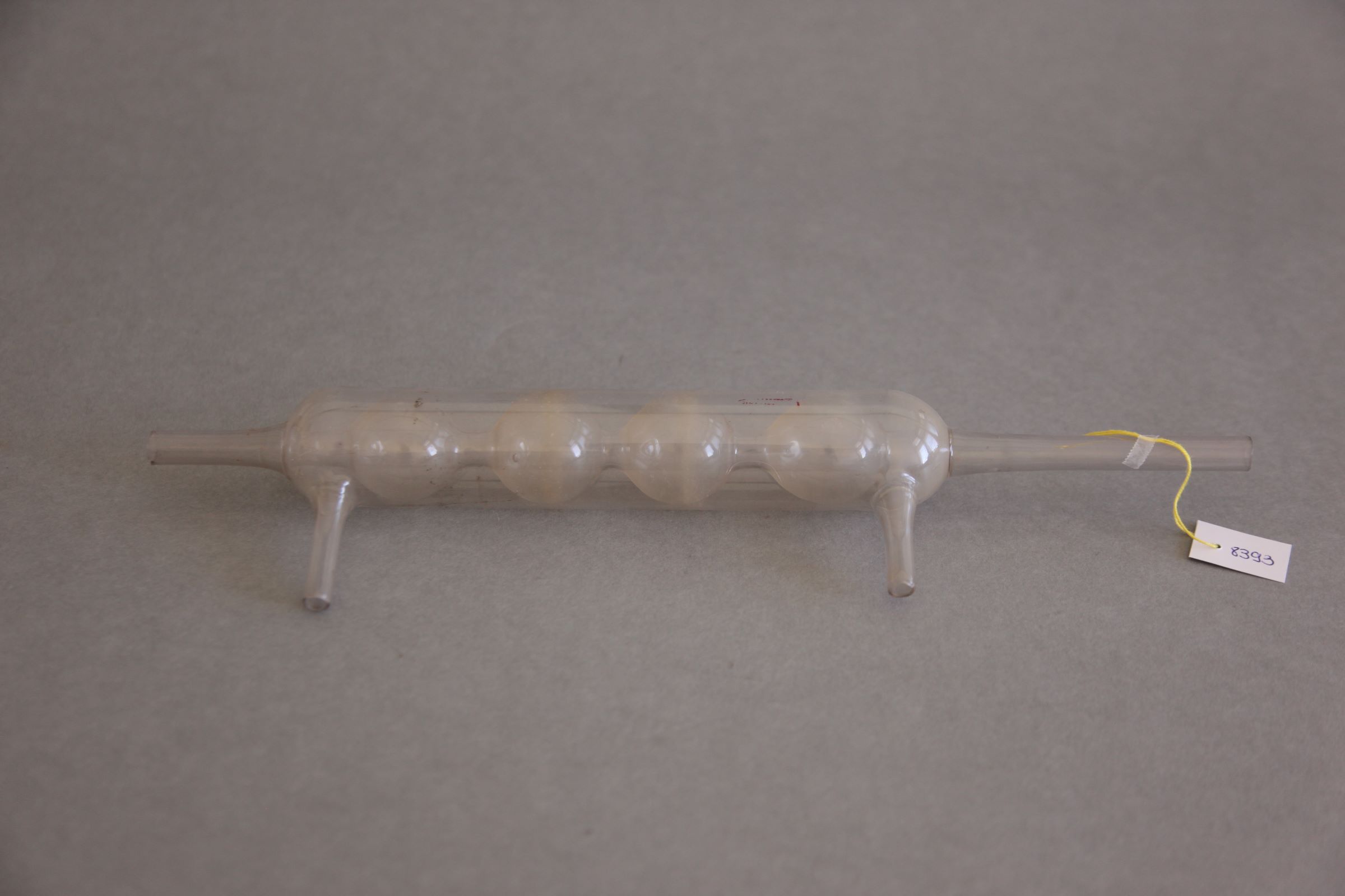 | Descrição: | Este objeto apresenta no seu interior diversas bolas podendo também ser designado por condensador de bolas tendo dois tubos na sua lateral. |