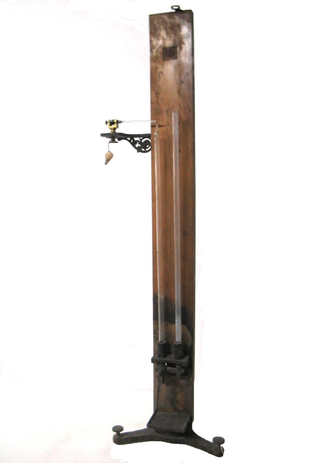 | Descrição: | O manómetro está instalado numa prancha de madeira, fixa verticalmente sobre um pesado tripé de ferro com parafusos de nivelamento. O ramo mais curto do manómetro estreita a determinada altura, dobra em ângulo reto terminando por um dispositivo de latão com uma pequena torneira. |