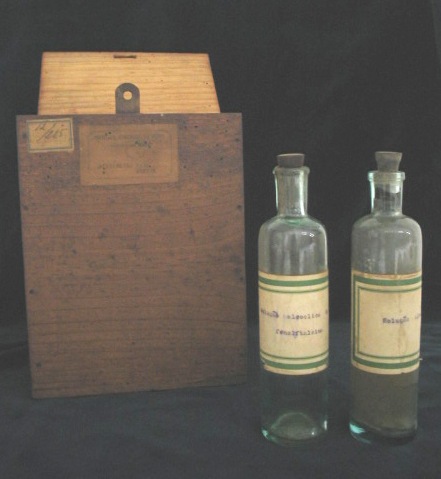 | Descrição: | Composto por uma caixa de acidímetro para azeite com dois frascos em vidro. Os dois frascos continham as seguintes soluções: solução alcoólica de fenolftaleína e solução alcalina. |