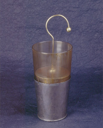 | Descrição: | Composta por armaduras móveis - dois vasos cónicos, um vidro e outro em metal e um terceiro vaso metálico fechado e munido de uma haste recurvada encimada por um botão. Estes vasos são colocados uns dentro dos outros tal como se observa. |