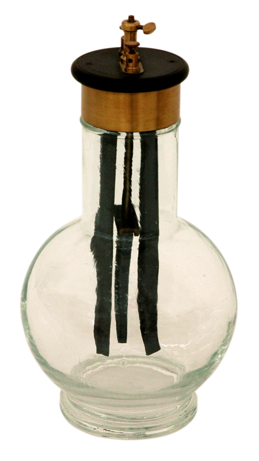 | Descrição: | Composta por um frasco de vidro, cujo gargalo possui uma tampa isoladora em ebonite, à qual estão presas duas barras de carvão das retortas ligadas exteriormente por uma lâmina metálica. Entre as duas barras existe uma placa de zinco amalgamado com metade do comprimento deste, presa a uma vara metálica que atravessa a tampa e que se destinava baixar ou elevar o zinco, a ligar ou desligar a pilha, e que termina num ligador. |