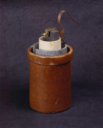 | Descrição: | Composta por um vaso poroso colocado dentro de um vaso impermeável de grés, entre os dois está intercalada uma lâmina de forma cilíndrica de zinco amalgamado que possui um ligador metálico ao topo. O vaso poroso contém uma barra de carvão das retortas munida de um ligador no topo e imersa no despolarizante, o ácido azótico. |